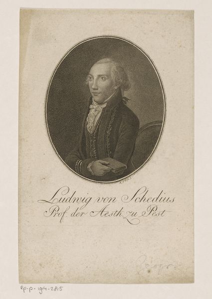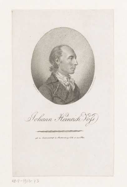 Curator: This engraving, titled "Portret van Jean-Marie Roland de La Platière," by Johann Ligber, was made sometime between 1770 and 1814, situating it right in the thick of the French Revolution. Editor: My initial reaction? Restrained. There’s a formality to it. The neutral background and tightly cropped oval give it an almost clinical feel, doesn’t it? Curator: Absolutely, and that very restraint speaks volumes. It’s a portrait intended for public consumption, designed to project a certain image of Roland – that of a serious, intellectual, and dedicated public servant. Neoclassicism was very much the order of the day. Think about the social and political context. Roland was a key figure— Editor: —Indeed! He was a Girondin leader and Minister of the Interior, but before we paint too rosy a picture of "public servant", let’s remember the Girondins were ultimately undone by the more radical Jacobins. This image, created during that tumultuous period, is undeniably a piece of political branding, a carefully constructed presentation. The frilled collar softens what might be severe, even austere. Curator: Right. He is wearing quite the cravat, but I also notice his gaze, direct and steady. Ligber uses the engraving technique to emphasize a sense of strength and intellect. The man looks every bit the Enlightenment thinker. I find myself considering how much control he would have had over the distribution and manipulation of these images, particularly given the revolution was churning through imagery very rapidly at the time. Editor: Exactly, we should really interrogate the notion of control. Consider how prints like this circulated—the publics that viewed them and their socio-political functions. It's quite thought-provoking when considering questions of power and revolution. Curator: I agree. The placement of text below Roland in the frame makes him almost an ideological figure more than an individualized portrait. Editor: He became a kind of emblem, really. Before the guillotine! An engraving such as this provides an intimate window into the self-construction and eventual fate of those enmeshed in a period of profound historical upheaval. Curator: A compelling case study then, of the power and precarity of images during revolutionary times.