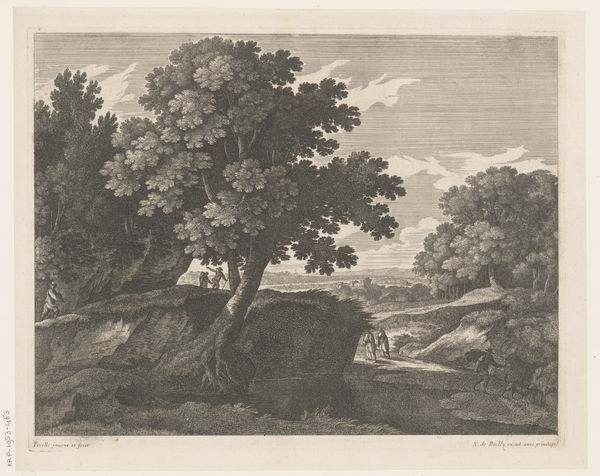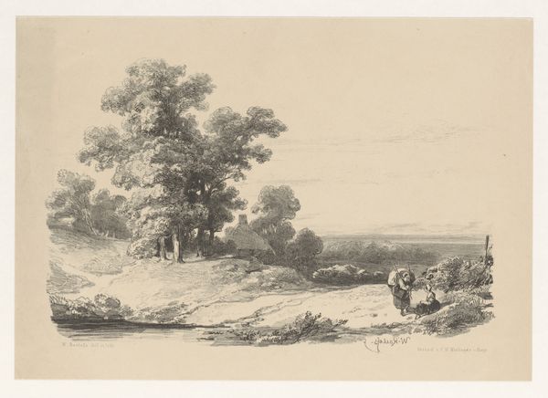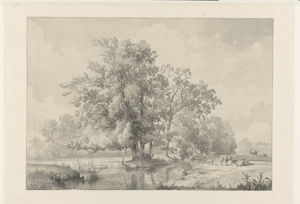Editor: So, here we have "Landschap met kastanjebomen" or "Landscape with Chestnut Trees" by Alexandre Calame, created before 1856. It's a pencil, graphite, and charcoal drawing. It feels quite detailed, almost photographic in its rendering of light and shadow, yet has a certain freeness. What catches your eye here? Curator: My interest is immediately drawn to the artist's meticulous handling of materials – the graphite, pencil and charcoal. The drawing allows us to consider the production itself. Note the contrast between the smoothly shaded sky and the textured bark of the trees. Do you think this variance serves simply aesthetic purposes or something more? Editor: Hmm, maybe it highlights the labour involved in creating such a detailed landscape. There is a real contrast between the light open sky versus the dense detail of the foliage. Curator: Precisely! This is not just about depicting a pretty scene. It is a demonstration of skill, and also echoes the material realities of art production during this period. Consider, for example, the accessibility of charcoal compared to oil paints – which impacts both the creation and the consumption of such work. Editor: I hadn’t considered the economics of the materials so much. Curator: Consider also, then, what’s depicted, the raw resources and its significance at this historical conjuncture: land, lumber, perhaps charcoal, the materiality speaks of the labor needed to render such “landscape”. Editor: That adds a whole new layer of interpretation! Looking again at the finished piece, it has become about the materials it’s made of, the labor involved, as well as being the subject of the artwork. Curator: Yes, and by examining these material underpinnings, we challenge traditional hierarchies and elevate our understanding of Calame’s creative process. The method here shows it has as much worth as the product, wouldn't you agree? Editor: I absolutely do, it opens up a whole new perspective. Thanks.