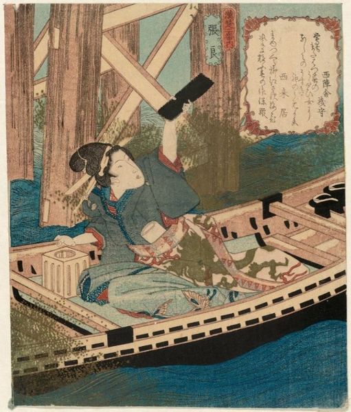 Editor: Here we have Utagawa Hiroshige’s woodblock print, "Haneda Ferry and Benten Shrine," from his "One Hundred Famous Views of Edo" series. I’m struck by the unusual perspective; it feels so immediate and immersive. What do you make of the composition? Curator: The cropping is indeed unconventional, focusing on the formal arrangement of elements: the strong diagonal of the boat’s beam, the rhythmic repetition of waves, and the subtle contrast between the foreground’s dark blues and the background’s muted pastels. Notice how these formal decisions guide our eye through the space. Editor: I see what you mean! The diagonal really emphasizes the depth and draws you into the scene. It’s less about the literal place, and more about how we perceive space and form. Curator: Precisely. The subject becomes secondary to the print's structural and visual qualities. Editor: Thank you, I will now look at art in terms of forms rather than subjects.