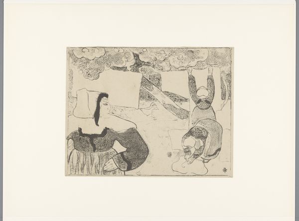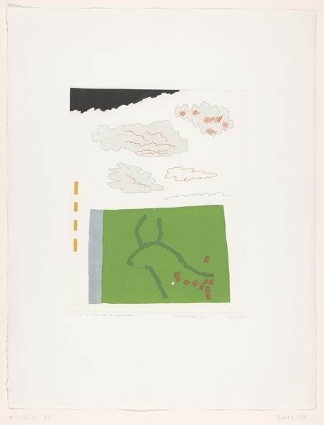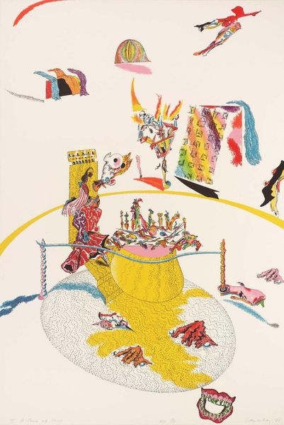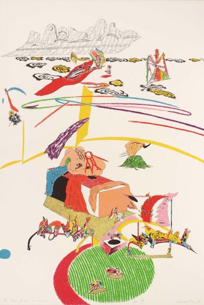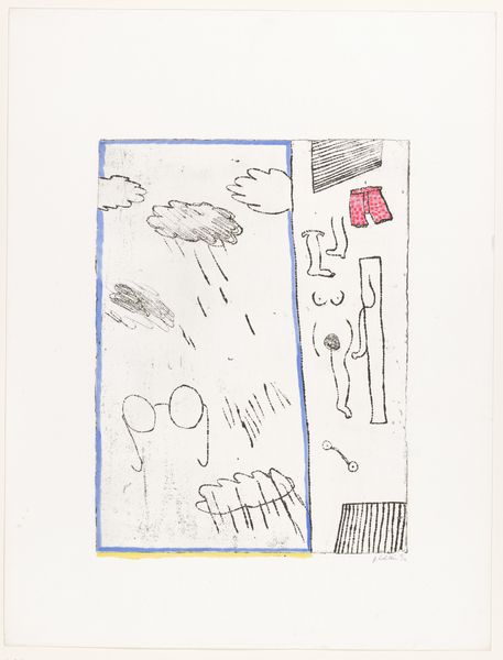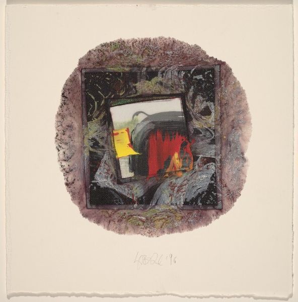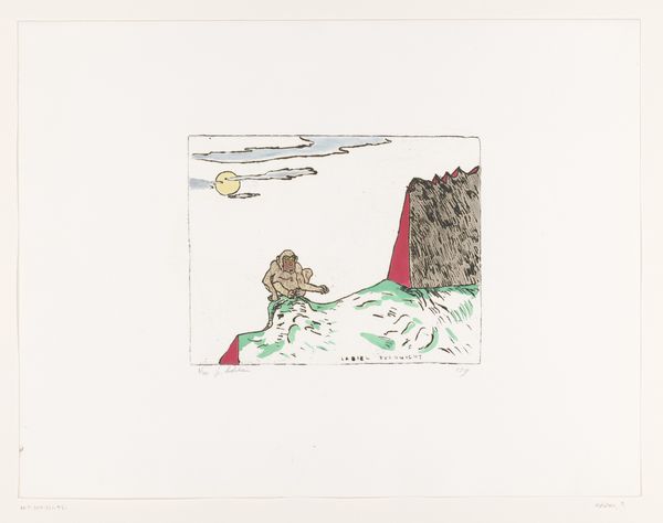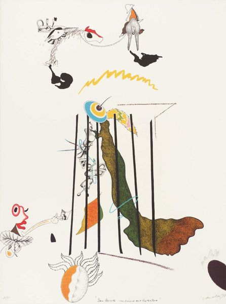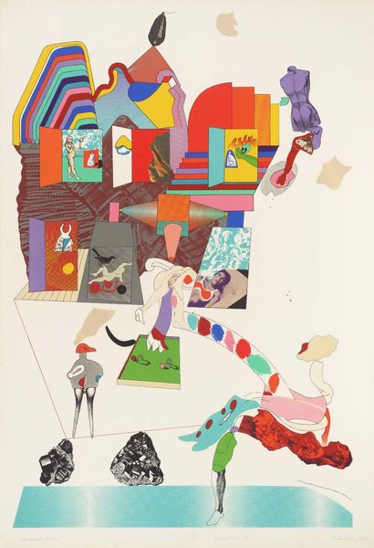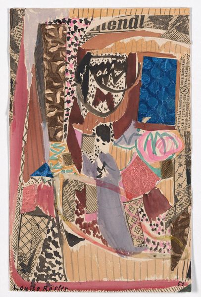Curator: Craigie Aitchison’s work, “Africa,” presents an enigmatic figure situated within a landscape of symbolic fragments. It’s currently held in the Tate Collections. Editor: The image feels like a collage of memory and symbolic representation. The colors are muted, and a certain dreamlike quality pervades the scene. Curator: Aitchison frequently explored themes of identity and race, using seemingly simple compositions to address complex socio-political narratives. Look at how the newspaper clipping contrasts with the romanticized floral elements. Editor: The flowers, along with the birds, might signify fragility or perhaps fleeting moments of beauty amidst historical weight, creating a stark juxtaposition with the figure's dark skin and the star-studded skirt. Curator: Precisely. This piece invites us to consider the historical and contemporary realities of race, identity, and representation, provoking questions about the legacies of colonialism and their impact on the individual. Editor: The symbolic language—the flowers, birds, the figure—it's almost like a visual poem hinting at deeper, unspoken stories. Curator: I agree, it's a dense intersection of history and personal expression. Editor: A poignant reminder that images can carry so much more than what we immediately perceive.