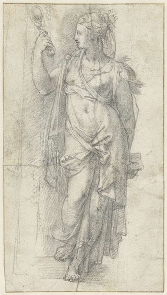 Editor: This is Pirro Ligorio's "Caryatid Facing Right," an ink drawing dating back to the 16th century. It depicts a classical figure, but there’s something slightly unsettling about her forced posture and the weight she bears. What's your take on it? Curator: The caryatid is a loaded symbol. We see her quite literally supporting patriarchal structures. Ligorio, working within the Italian Renaissance, draws from classical antiquity but subtly reinscribes its power dynamics. Have you considered the historical context of female representation during this period? Editor: I hadn’t thought about that specifically. So, are you suggesting that the drawing isn't just a study of classical form but also a commentary on the burdens placed upon women? Curator: Precisely! The stoicism in her face, combined with the architectural weight she bears, speaks to the expectation of female endurance. Consider how the drawing reduces her to a structural component rather than celebrating individual agency. Do you see the potential for reading the column she supports as symbolic? Editor: As oppressive power? Yes, I can see that. The expectation of bearing burdens placed upon them. Curator: It's through understanding these intertwined historical, social, and artistic contexts that we reveal the complexities within even seemingly simple drawings like this one. Editor: Wow, I didn’t expect there to be so much more to the work! Thanks for unpacking that for me. I'll definitely consider the socio-political contexts moving forward. Curator: Likewise, your insight into its unsettling nature is a great point of entry to interpreting art, so thanks for that.