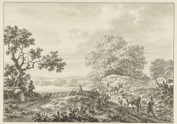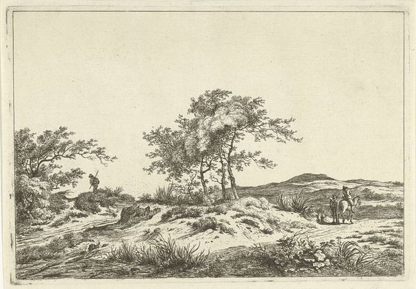 Editor: This is "Landschap met ruiter en voetganger," or "Landscape with Rider and Pedestrian" by Hermanus Fock, made sometime between 1781 and 1822. It's an etching, which is so cool. I'm struck by how the stark lines create this kind of lonely, expansive mood. What do you see in this piece? Curator: Well, immediately I’m drawn to the figures, how small they are against the landscape. Notice the visual hierarchy. It’s not really *about* them. They’re symbolic. Editor: Symbolic of what exactly? Curator: Think of the Romantic period, a deep reverence for nature, dwarfing humanity. That horseman… a clear image of authority and travel, a journey through life. Then there’s the solitary figure on foot, perhaps representing a different kind of experience. Maybe, hardship? How do you interpret the dichotomy? Editor: So, you’re saying the rider represents someone maybe privileged, while the walker represents just an ordinary person. The journey, life itself is different depending on your class. Curator: Exactly! But what about the land? A common thread to both parties in life. What about the symbolism of etching? The artist carves his intentions directly in a process, demanding detail in every mark, and leaving lasting impression. Editor: Wow. It definitely reframes how I view the riders within this grand landscape. The figures show inequality as well as individuality as everyone experiences life differently. Thanks, this was really eye-opening! Curator: A reminder that landscape speaks more profoundly than individual portraits!