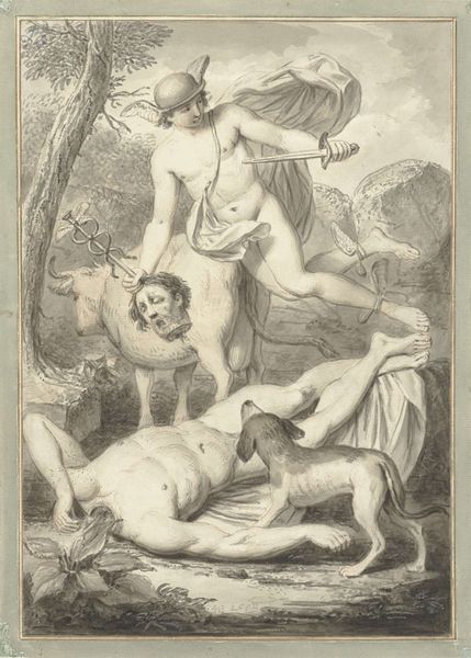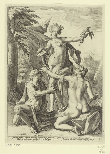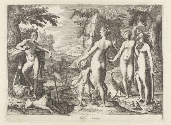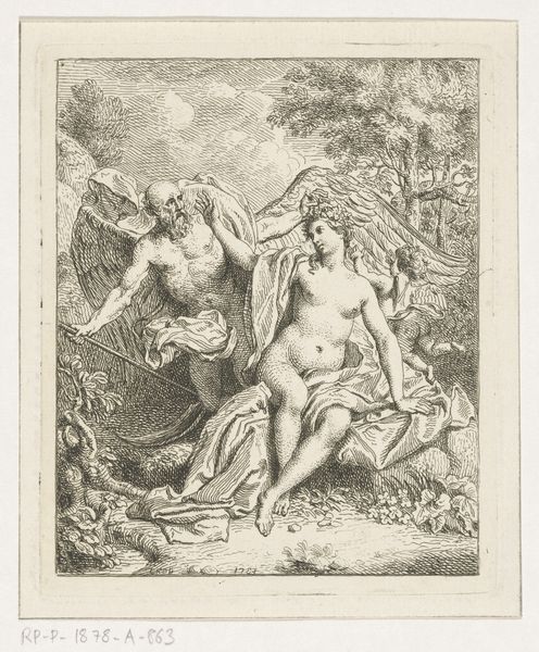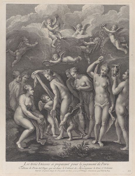 Jacques Jean Pasquier created this print, "Drie Gratiën", sometime in the 18th century. The three graces dominate the scene, their forms rendered in delicate lines. This monochromatic palette emphasizes the textures of skin, drapery, and foliage. The composition is structured around the central figure, anchoring the group and leading the eye in a harmonious flow across the trio. The figures are set against a backdrop of dense foliage and a draped cloth, which adds depth and a sense of theatrical space. Pasquier's strategic use of light and shadow models the figures and enhances their three-dimensionality. Pasquier is not merely depicting idealized beauty but also engaging with classical themes through the language of form. This print functions as a cultural artifact, reflecting the aesthetic and intellectual values of its time. These are continuously re-evaluated through our contemporary lens.