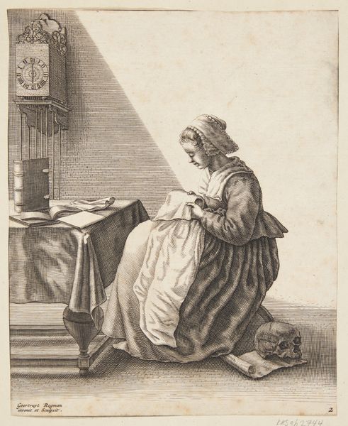 Pieter Willem van Megen made this print of a woman reading sometime before his death in 1785. The image creates meaning through a set of visual codes that would have been easily recognized in the Netherlands at the time. The woman’s dress and comportment suggest that she is a member of the bourgeoisie, or middle class. Literacy was becoming an increasingly important status marker, and reading was seen as a genteel accomplishment, especially for women. It is possible that the artist intended to encourage the rising literacy of women, but we might equally view this print as a tool for teaching young women to embody values of their time. Prints like this one circulated widely, and we might find out a great deal more about how they functioned as agents of social change by looking at the archives of the Dutch print trade.