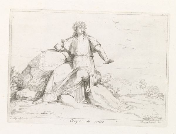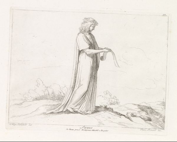 Damiano Pernati created this image of Vergilius, likely in the late 18th or early 19th century. Pernati was working during a time of great social and political upheaval, particularly influenced by the Enlightenment. The artist was born in the final years of the Venetian Republic which was then dissolved by Napoleon. Here, Vergilius is depicted wearing a laurel wreath, a symbol of poetic and intellectual achievement, but his gaze is directed away. He stands on what looks like a barren, undefined landscape. What might he be contemplating? The role of the intellectual in times of political upheaval, perhaps? Consider this image as a representation of the artist’s own sense of displacement and longing for a more stable and coherent world. Pernati's Vergilius captures a moment of introspection, inviting us to reflect on the complex interplay between personal identity, historical context, and the enduring power of art.
