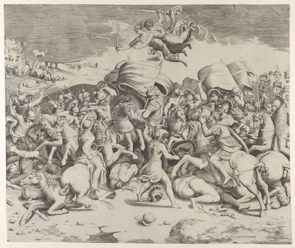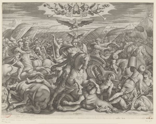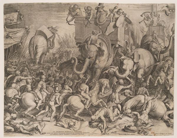 Cornelis Cort made this print, "The Battle Between Scipio and Hannibal at Zama", in the late 16th century, a time when Europe was grappling with its relationship to its classical past. Here, Cort depicts a pivotal moment in the Second Punic War, framing it through a lens that emphasizes Roman strength and order. But what does it mean to represent a battle where one side, Carthage, was not European? Consider the power dynamics embedded in such a portrayal. The print not only illustrates a historical event, but also speaks to the Renaissance fascination with power, empire, and the "other." Look closely, and you'll notice how Cort uses the chaos of battle to highlight Roman victory, subtly reinforcing a narrative of European dominance that was gaining traction at the time. The emotional intensity of the scene serves to draw viewers into this narrative, implicating us in its complex legacy. How might this image have been different if seen through Carthaginian eyes?