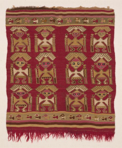 This 'Head Shawl' of unknown date, by an anonymous artist, captivates with its vibrant color and symmetrical design. The overwhelming impression is the colour red, a dense, all-encompassing field that both excites and grounds the composition. Horizontally, the piece is segmented into distinct bands, delineated by thin, gold-like stripes. These stripes create a rhythmic pattern. A striking border adorned with geometric shapes frames the central field of red. This structured approach gives a sense of order and balance. Yet, the lack of a clearly defined origin or artist destabilizes traditional art-historical narratives. The 'Head Shawl' challenges the concepts of authorship and artistic intention. Its aesthetic power resides in its inherent form, which creates meaning through geometric organisation rather than narrative content. Therefore, the shawl asks us to consider how meaning can arise from structure alone, independent of historical context.