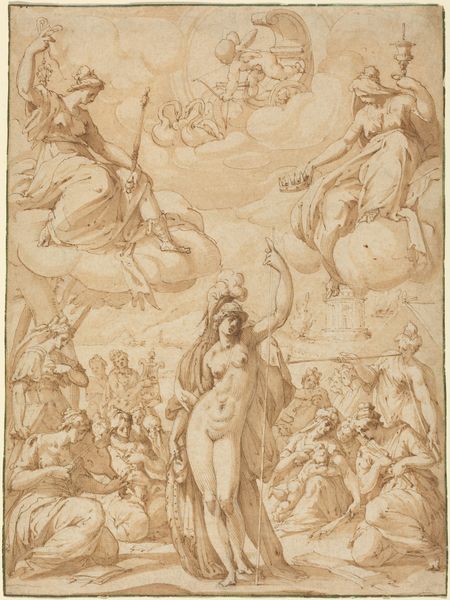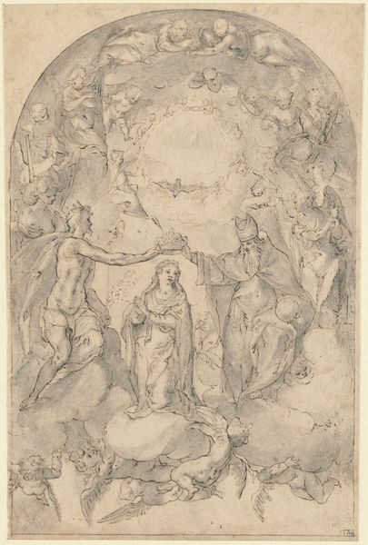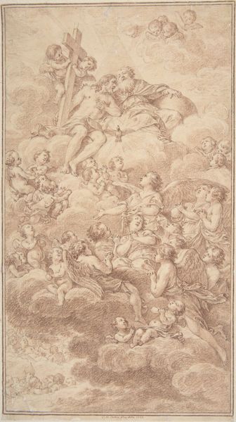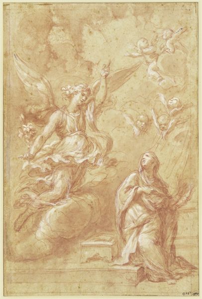 Francesco Vanni created this red chalk drawing, *Madonna and Child Presenting Scapulars*, in Italy sometime between 1578 and 1610. The image depicts the Virgin Mary and the infant Jesus, surrounded by angels and saints, bestowing scapulars, or devotional garments, to kneeling figures. The drawing reflects the cultural and religious context of Counter-Reformation Italy. The Catholic Church used art to reinforce doctrine and inspire piety. Vanni, trained in Siena, infused his work with a blend of graceful Mannerism and Counter-Reformation ideals. The image creates meaning through established visual codes. Mary's elevated position and the presence of angels signify her divine status. The act of bestowing scapulars symbolizes divine grace and protection offered to the faithful. To fully understand the drawing, we need to consider the history of religious orders, devotional practices, and the social functions of art in early modern Italy. By exploring these avenues of inquiry, we gain a deeper understanding of the dynamic interplay between art, culture, and belief.