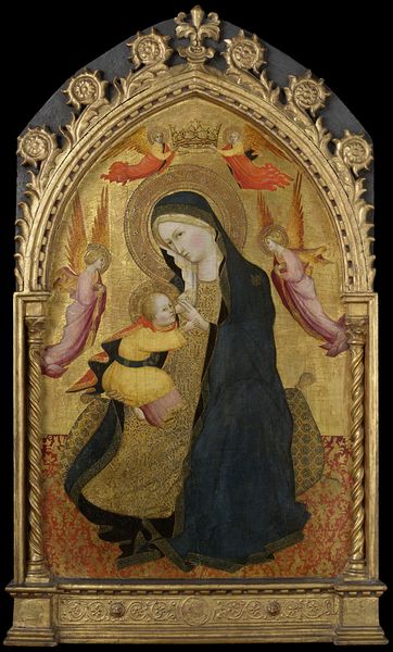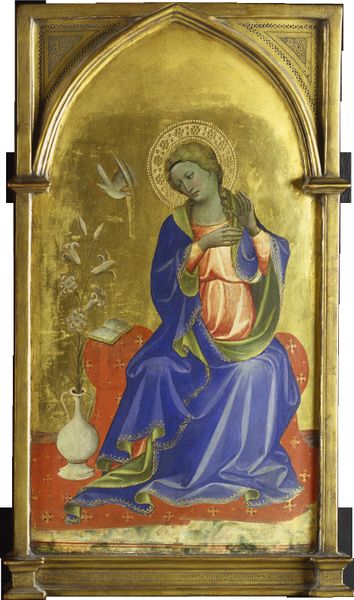 Editor: This is "Archangel Gabriel," an oil painting on a wood panel by Gherardo Starnina, created between 1404 and 1407. The angel seems to be pausing, caught in a moment of deep reflection...almost hesitant. I’m struck by how human the figure appears, despite the wings and halo. What are your thoughts? Curator: It’s beautiful, isn’t it? To me, Gabriel's humility is particularly poignant. The Early Renaissance, even in its religious depictions, sought to capture a more grounded sense of human emotion and experience. Notice the folds of the fabric, rendered so carefully... what do they evoke for you? Editor: A sense of gravity, perhaps? As if the fabric itself is heavy with meaning, mirroring the weight of the message Gabriel carries. I suppose it contrasts a lot with earlier, flatter depictions I've seen. Curator: Exactly. This piece hints at the transition toward greater realism, depth. Think about it – Gabriel is about to deliver earth-shattering news, news that will alter the course of history. Starnina’s captured a fragile moment, a delicate intersection between the divine and the earthly. The setting's minimalist backdrop helps highlight this duality. But don’t you wonder, looking at it, what IS he thinking, knowing what’s coming? Editor: That's a great question. I suppose that's part of why it resonates even now, so many centuries later. I've definitely gained a fresh perspective on Early Renaissance art. Thanks! Curator: My pleasure! I always learn something new by just taking a closer look at details like these. It reminds me to look beyond the surface.