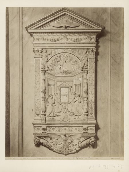 Curator: The work before us is a photograph of the Grafmonument van kardinaal Cristoforo della Rovere in de Santa Maria del Popolo te Rome, taken by James Anderson, sometime between 1857 and 1875. Editor: Woah, immediately I get this deep sense of peace and solemn quiet. The soft sepia tones, the intricate carving… it’s like stepping back into a hushed, sacred space. Curator: Anderson, as a photographer, was deeply interested in documenting artworks and architecture, and we should understand his pictures in their historical context. His images weren't just documentation, but often commissioned artworks, in a world where photography played an increasingly large role in art history itself. This image captures not just a monument, but its photographic representation. Editor: Absolutely, this image transcends documentation; it feels imbued with reverence. See the light catching the marble? And those angles! They give a sense of almost holy geometry... I am picturing the sculptor agonizing over every curve, every cherub's wing. It makes you think about mortality, doesn’t it? The cardinal is laid out, in stone now himself, waiting... Curator: Precisely. The Cardinal della Rovere was part of a very powerful family in the 15th and 16th centuries and played an important role in papal politics. A grand tomb wasn't just a memorial, it was also a statement of power and influence, reflecting both the family’s status and their continuing legacy through the church. Editor: Looking at the detailing, you sense a yearning for eternity, a desire to carve out a space in time... or beyond it! All the decoration, the details in marble are stunning. Did the photograph allow more people to contemplate the cardinal's legacy? To stand before the grand monument from afar? Curator: It is quite possible, although these images were often circulated amongst art historians and the wealthy classes at the time. The wide circulation among popular audiences hadn't quite taken off yet, but that role of democratizing art access became crucial soon afterwards, particularly through postcards. Editor: Thinking about those postcards now puts everything in context. Almost like souvenirs… Death goes to the masses! So many interpretations and levels to the original carving and monument; amazing the conversation all born from a picture. Curator: A fascinating collision of artistry and technology reflecting faith, power, and the evolving relationship between representation and reality in the Victorian era. Editor: A fitting end that feels right; makes me reflect about legacy... What will be captured about our time now for others to witness someday? Deep.