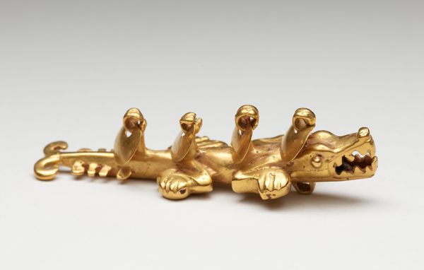 Curator: So, what catches your eye first about this Diquis pendant, crafted somewhere between the 9th and 15th centuries? Editor: Its pure gleam. You can almost feel the sun beating down on it. Makes you wonder about the hands that shaped such intense gold. Was it dug up, panned from a river… I’m instantly curious about the source, the labor involved in procuring that raw material. Curator: It's captivating, isn't it? Looking at it, I imagine someone carefully selecting the perfect nugget, melting it down, shaping it with meticulous detail. It feels charged with intention and maybe ceremony, designed to hold significance beyond simple adornment. Editor: Ceremony is right. Think of the societal stratification it implies. Gold was likely reserved for elites. The skill to work this material indicates specialized labor, resources carefully allocated. I see power dynamics encoded in the sheen. Curator: Yes, but consider what those dynamics valued. The intricate craftsmanship suggests an honoring of nature, perhaps a reverence for the animals represented here. See the curled antennae, suggestive of a cicada or beetle, the bulbous body hinting at fertility and renewal. I think they may have worn it to harness qualities of nature, hoping to bring power and energy from it. Editor: That connection is likely present but inseparable from economic considerations. Were such natural sources considered communally held or the strict purview of specific individuals who controlled distribution of the golden icon? What does its placement in this museum tell us about this legacy, its display and contextualization today? Curator: Those are exactly the critical questions to ask ourselves. Maybe we can think of it as the intersection of ingenuity and exploitation; that complexity makes it all the more worth appreciating and reckoning with. Editor: Absolutely. Seeing something so intrinsically valuable recast within contemporary dialogue prompts deep thought about what constitutes ‘value’ across centuries. I find this object really provocative as it opens these vital pathways to conversation. Curator: It becomes a mirror, doesn't it? Reflecting not only the light but also the weight of our history and present choices. I agree. Editor: Exactly, a lens to reflect labor practices and the shifting status of precious materials across time.