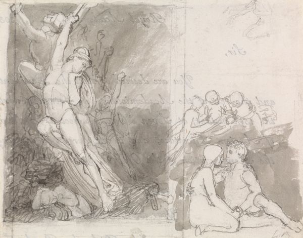 Curator: Well, that feels intimate somehow, like catching a glimpse of someone’s secret thoughts, doesn’t it? The flurry of lines—it’s a little hazy but also surprisingly tender. Editor: Indeed. We're looking at Célestin Nanteuil’s “Study for Sheet Music Cover,” likely from sometime in the 19th century. It’s rendered in pencil. The work currently resides here at the Minneapolis Institute of Art. Curator: A study, yes, I love that. It really does show how ideas evolve. It reminds me of a composer tinkering at a piano, searching for just the right melody. It’s… searching. The pencil lines everywhere sort of vibrate with possibility. What do you notice formally? Editor: The composition divides rather distinctly into two registers and a central vertical, though not perfectly symmetrical. There’s a face sketched up top in a squared frame; figures dominate below. Observe how Nanteuil uses line weight and density to define forms and spaces; see, for instance, how figures fade in and out of legibility in the lower grouping. Curator: Yes, like they’re emerging from memory or imagination itself! Look, there's drama unfolding: A prostrate figure to the left. Further to the right, near the implied trunk of a tree, you can make out some figures in emotional exchange—or at least, that's my impression. Editor: The distribution of forms creates a complex relationship between narrative and structure, something of a hallmark in Romanticism. He emphasizes contrasts to amplify the pathos in the composition. Curator: Pathos is the right word. The unfinished nature of the sketch actually heightens the feeling, doesn't it? The imprecision lets our imaginations fill in the blanks, connecting with it more directly. The implied narratives make it feel deeply personal. Like these aren't just characters, but archetypes, perhaps. Editor: The use of graphite allows for corrections and adjustments—changes in thinking visible to us today. Curator: Seeing this work, it does makes me consider art’s role in emotional expression... How even a preliminary sketch can possess so much power and vulnerability. Editor: Ultimately, what fascinates me is its glimpse into Nanteuil's process. These kinds of artifacts showcase the intrinsic interplay of art's making.