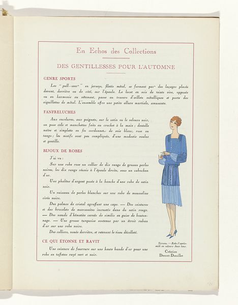 This page from "Art - Goût - Beauté" was made in November 1928 using printmaking. You know, the way the simple lines create these fashionable women and the interior space makes me think about how the image was constructed. It's all about the layering, isn't it? Look at how the different planes and textures of the fabrics are rendered with such sparse marks! The artist has made some simple and elegant lines, giving us just enough information to imagine the weight and drape of the fabric. I’m drawn to the pale yellow, almost cream, palette. It feels muted and reserved, yet hints at light and shadow, giving depth to the scene. See how it creates these subtle differences in tone? It’s all about process, each layer informing the next. The composition reminds me of some of David Hockney's set design work, like he's arranging figures in a stage set. Both artists share a playful and experimental approach to rendering space and form through color and line. It's just an ongoing conversation, this art thing. And of course, there's no one 'right' way to look at it!