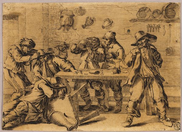 Editor: Charles-Nicolas Cochin’s etching, "A Rustic Family Dining Out-of-Doors," depicts just that, a family picnic! There's a sense of both merriment and social observation in its details. What symbols stand out to you in this depiction? Curator: The outdoor meal itself is symbolic. Communal eating, especially al fresco, often represents a temporary escape from societal constraints. Notice the hats—they seem to suggest social roles, don’t they? They give us clues to how individuals wish to be perceived. What emotional tone do you detect? Editor: I sense both joy and a hint of melancholy. There's freedom in the outdoors, but the figures also seem a bit contained, as if performing. Curator: Exactly! The performance of social roles versus genuine interaction is a recurring theme. Consider the child on the ground, separate from the table. A fascinating visual cue of social exclusion, wouldn’t you agree? It gives one pause. Editor: I hadn't noticed that before. It adds a whole new layer of meaning to a seemingly simple scene. Thanks!