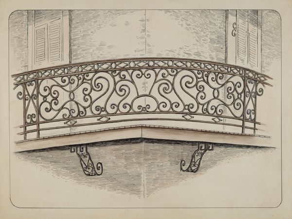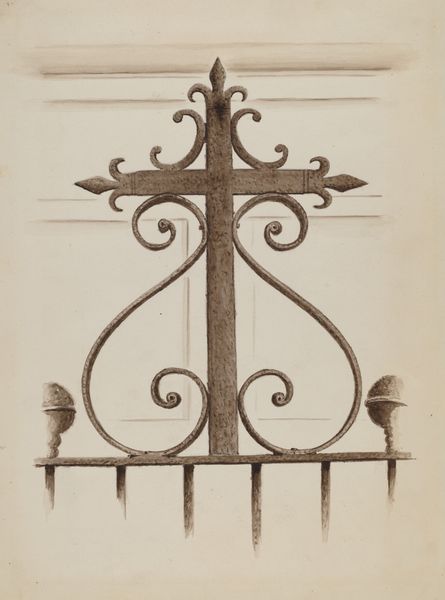 Curator: This is a drawing entitled "Scroll" by Max Fernekes, created in 1938 using watercolor and pencil. Editor: It has an oddly elegant, somber feel. Like a relic carefully rendered. The sepia tones and aged paper amplify that sense of preservation, even reverence. Curator: Interesting take. For me, it prompts questions about industrial design, particularly during the late 1930s. What sort of skilled labor was involved in crafting such detailed ornamental pieces? Was this a proposal, or simply a rendering of an existing artifact? The means of production is very suggestive here. Editor: Absolutely. But that spiraling scroll evokes something deeper for me – a sense of continuous return, perhaps echoing the cyclical nature of time itself. The way the tendrils unfurl, reminiscent of ancient Celtic knotwork. It’s an echo of classical forms filtered through a particular artistic sensibility. Curator: Right, I’m compelled by what the artifact represents about architectural design history of the period. How it might connect to contemporaneous economic challenges as the economy and manufacturing was transforming in this country. The medium employed suggests thoughtful and deliberate work, resisting ideas of mechanized means of production and its efficiency. Editor: Don’t you also think it embodies a search for order, perhaps as a symbolic remedy to external disorder? The ornamental scroll as a defiant, handcrafted emblem against a backdrop of societal upheaval. And also, a sense of identity for those craft workers through this beautiful form. Curator: Identity and labor are intertwined in the physical act of drawing and the tangible result of watercolor on toned paper. Editor: The symbol’s power relies precisely on this physical articulation. Well, this brief investigation has deepened my understanding of the layered potential contained in this artifact. Curator: Indeed, it encourages to further delve into how we assess the value and means of production, as the context for cultural and economic identity.