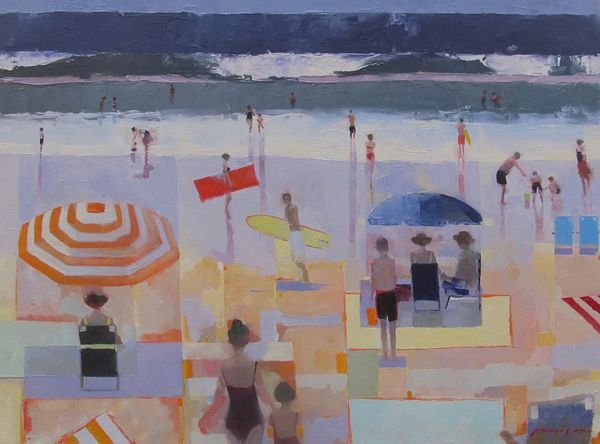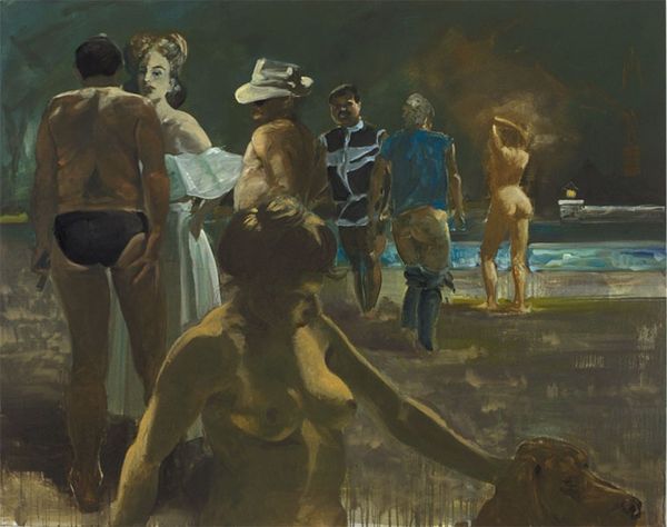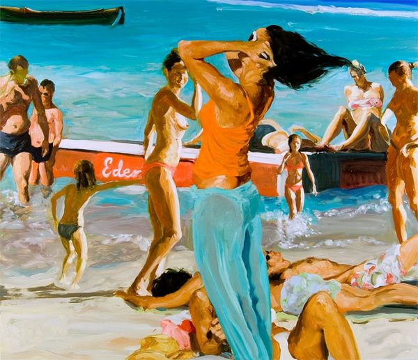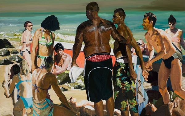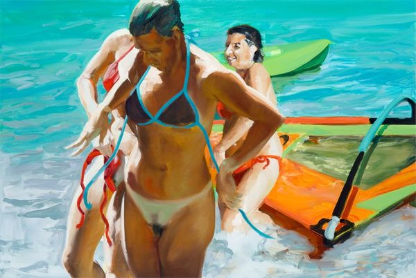 Editor: We are looking at Eric Fischl’s “Scenes From Late Paradise The Drink”, an oil-on-canvas painted in 2006. I’m immediately struck by the light, the loose brushwork, and the contrast between the figures in the foreground and background. What draws your eye in this piece? Curator: Indeed. One observes a careful orchestration of visual elements, most notably the spatial arrangement of the figures. Notice how Fischl employs a high degree of realism for certain elements – consider the musculature of the figures – while other passages seem deliberately simplified. Are these intentional ambiguities to subvert expectations about representation? Editor: That’s interesting. I hadn’t considered the deliberate nature of that simplification. Do you think the title offers any clues as to the interplay between the realism and simplification you pointed out? Curator: Possibly. "The Drink" introduces a narrative element, yet the composition’s strength lies in its formal qualities: the relationship between planes of color, the push and pull created by varying levels of detail, and the unsettling balance of light and shadow across the bodies. The tension between these observations produces an intriguing reading. Consider the use of foreshortening; what does it achieve within the visual framework? Editor: I see what you mean. The artist seems to be using the tension between a recognizable scene, the foreshortening of perspective, and the abstraction of the forms and color, which contributes to the painting's unique impact. Thank you. Curator: My pleasure. Formal analysis allows us to grasp these intricate aspects, furthering our understanding of the artist’s intention to manipulate visual dynamics.