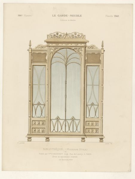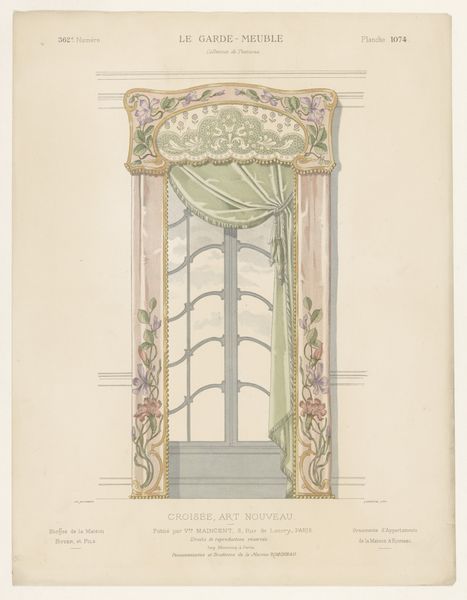 Curator: Here we have "Venster met gordijnen," a drawing by Léon Laroche, created sometime between 1895 and 1910. Editor: It evokes such a feeling of faded grandeur, doesn't it? The muted colors, the stylized floral patterns… Curator: Absolutely. Let's delve into the compositional elements. Notice the almost mathematical precision of the window panes, contrasting with the more organic curves of the draping curtain. The window, with its rigid geometry, symbolizes order and reason—cornerstones of Neoclassical thought, despite its later creation. Editor: While you're drawn to the forms, I'm immediately focused on how it was likely made. The drawing’s precision suggests preparatory design work, perhaps intended for fabric or wallpaper production. These patterns weren't simply aesthetic; they were meant to be reproduced, distributed, and consumed, linking the artist to a whole network of makers and vendors. Curator: That's a valid point. But let's consider the symbolism inherent in the artist's choices. The decorative arts style incorporates idealized roses and what seems to be honeysuckle—flowers frequently used to convey themes of beauty, fleeting love, and the cycle of life. The careful integration of these motifs into the architectural form speaks to a broader engagement with symbolic languages. Editor: I'd argue those roses speak less to Neoclassical symbolism, and more to a striving towards luxury. These motifs, rendered in muted colors on mass-produced items, brought a sense of upper-class elegance into more common homes. The means of their production and distribution are key to their significance. We also can't discount that this drawing is on paper, not canvas: the ephemeral, potentially disposable nature is central. Curator: An astute observation, even if I find your materialistic interpretations a bit reductive at times! However, these contrasting frameworks enhance our viewing of this image. We can perceive the structure, the design. Editor: And consider the process, the networks—its consumption, to fully understand what we're seeing here. It helps show its original context.