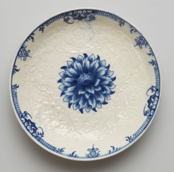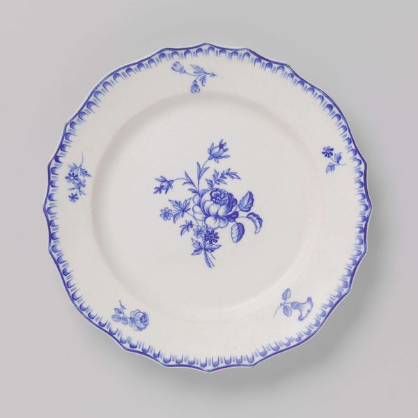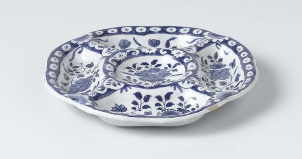 This oval dish is made of ceramic. While its maker is unknown, the plate presents a compelling study in form and design. The dish is dominated by a central floral arrangement, its deep blue hues sharply contrasting against the white background. Smaller, carefully positioned floral motifs surround this central element, creating a balanced, almost symmetrical composition. The use of blue isn't just decorative; it’s structural, defining shapes and creating a visual rhythm across the surface. The oval shape of the dish itself is significant. The plate is a canvas, where the flowers are arranged in a manner reminiscent of classical still-life paintings, yet the lack of depth flattens the image. The edge of the plate is adorned with simple geometric shapes, creating an interesting contrast with the fluidity of the floral patterns. The pattern is an aesthetic choice, but also functions to contain and frame the artwork, drawing the eye back to the dish's contents. This interplay of shape, color, and pattern challenges our perception, prompting us to reconsider the relationship between form and function.