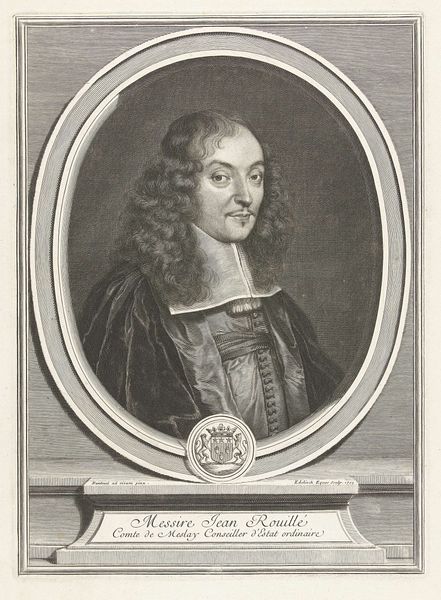 This is Cornelis van Dalen II’s portrait of James Stuart, King of England. Look closely at the complex interplay between form and content. The oval frame, adorned with meticulous detailing, immediately draws our attention. The frame, rather than simply containing the portrait, seems to engage with it, creating a sense of depth and layering. Consider how the artist uses the contrast between the smooth, polished surface of the frame and the intricately rendered details of James Stuart's face and attire. This juxtaposition invites us to contemplate the relationship between representation and reality, between the idealised image of kingship and the individual. The composition destabilizes any fixed meaning; it's an invitation to consider the ever-shifting nature of identity and representation. The artwork functions aesthetically and participates in a broader cultural discourse about power, representation, and interpretation.