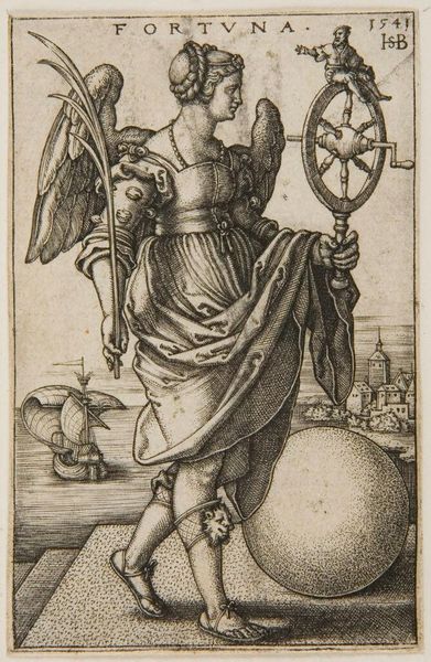 Editor: This engraving is called "Melancholia," created by Sebald Beham around 1539. What strikes me is the sheer weight of sadness emanating from this winged figure. How do you interpret this work? Curator: Oh, that exquisite weariness! It's not just sadness, but the burden of knowledge itself. Beham captures the Renaissance struggle between earthly pursuits—note the tools scattered about—and the yearning for the divine, represented by the wings. Doesn't it feel like she's grounded by her own intellect? Editor: I see what you mean. There's a real tension between aspiration and limitation here. Curator: Exactly! And isn't that the human condition in a nutshell? It reminds me of that feeling after finishing a brilliant project... and immediately feeling empty. Editor: It's as if the pursuit of knowledge has brought her to a standstill. Thanks for sharing your perspective! Curator: My pleasure! This tiny work holds a universe of feeling, doesn’t it?