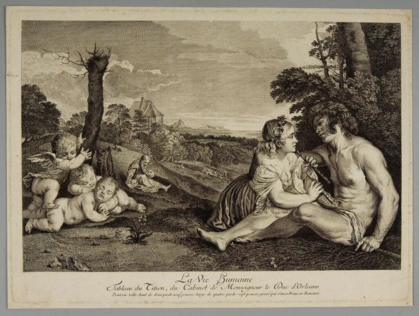 Curator: Gaspard Duchange created this engraving, Diana and Her Nymphs Bathing. I'm immediately struck by the central figure's languid repose. Editor: It feels like a stolen moment, doesn't it? The iconic scene of Diana, the huntress, vulnerable and relaxed in her bath. Note the bow and quiver hanging in the tree above. Curator: The placement of the hunting equipment so far above seems almost symbolic of a shedding of her usual power. Bathing is an act of purification and vulnerability. Editor: Absolutely. And the cultural memory of the Diana myth is crucial here. Her purity was fiercely guarded, and any intrusion a grave offense. Curator: It's also worth observing how Duchange leverages the visual power of classical allegory to reflect and reinforce societal structures and expectations regarding female behavior and virtue. It became a charged political symbol. Editor: Looking at it now, I'm reminded of the power these images held, and still hold. Thank you for pointing out its enduring social and symbolic meaning.