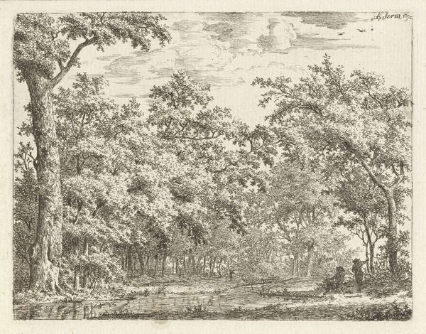 Curator: Let’s turn our attention to this etching, "Bosgezicht, op de voorgrond een tekenaar," or "Wooded Landscape with a Draftsman in the Foreground," created sometime between 1798 and 1837 by Ernst Willem Jan Bagelaar. Editor: It’s a dense, almost claustrophobic image. The trees dominate, and the stark black and white creates a somewhat somber mood, a feeling of being enclosed. Curator: Bagelaar worked during a time when the appreciation of nature and the rural was becoming increasingly important, in response to the industrialization of the landscape and the socio-political unease roiling through Europe at that time. The forest here becomes a site of refuge and reflection. Editor: It's interesting how the artist has positioned the figure of the draftsman within that context. The act of observation, of documenting the natural world, takes center stage. It reads like an affirmation of humanity’s connection with nature, though one filtered through a specific gaze – that of the educated artist, of course. What isn't obvious at first, but apparent in subsequent glances, are the walkers far off in the background that enhance a sense of nature's overwhelming scale. Curator: And notice how Bagelaar uses the technique of etching to build up layers of detail, particularly in the rendering of the leaves and branches. There is a commitment here to depicting the wild, abundant quality of nature. Editor: That technique really brings out the tension between control and chaos. There’s the precision of the lines, but then the sheer profusion of them, mimicking the complexity of a real forest. I'm curious, who had access to these kinds of landscapes at that point in history, and how are their portrayals potentially reflective of their privileged perspectives? Curator: Certainly, the romanticization of nature could be interpreted through a lens of class and access. It reflects a particular leisure enjoyed by some in society who were detached from labor and industrial growth. It also created a kind of ownership, of curating our relationship to an imagined "pure nature." Editor: Thank you, I really appreciate the nuance here; it deepens my appreciation, and reminds me to think critically. Curator: Exactly. This piece really serves as a time capsule; it enables us to see how notions of landscape, identity, and socio-political reality come together in artistic representation.
