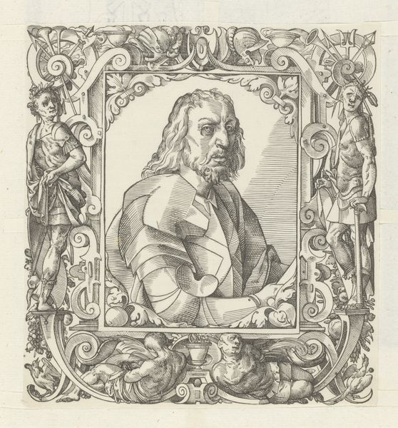 Editor: Here we have Enea Vico's "Portret van Christus," created around 1550 using engraving techniques. The figure is enclosed in an elaborate frame. There's something almost unsettling about the directness of his gaze and the decorative details around him. What strikes you most about this portrait? Curator: For me, the engraving immediately speaks to the turbulent socio-political environment of the mid-16th century. The Mannerist style, with its heightened emotion and dramatic composition, reflects the religious anxieties of the Reformation. Vico’s choice to depict Christ in profile, within such an ornate and somewhat suffocating frame, almost hints at the restrictions placed upon religious expression at the time. Editor: I see what you mean about the restrictions. Do you think the putti and other ornamental flourishes are simply decorative or might they hold deeper significance? Curator: I think we must question those visual choices! The putti, common in Renaissance art, usually represent divine love. However, placing them alongside such a solemn figure raises questions. Are they there to console or to perhaps subtly highlight the complexities and inherent contradictions within religious dogma of that period? Perhaps Vico is using familiar symbols to prompt viewers to contemplate their own evolving relationship with faith. Editor: That’s fascinating. I hadn’t considered the deliberate contradictions in the image. I was too focused on the overall effect and didn't delve deep into each element of the engraving. Curator: Exactly! Art of this period encourages us to interrogate, not just observe. Think of it as a visual argument about belief and its place in society. Editor: This makes me think about how the print, as a reproducible medium, also made religious imagery more accessible. Thanks to our conversation, my perspective of Vico’s "Portret van Christus" has shifted dramatically. Curator: Mine as well! The complexities within the image now make even more sense in the light of mass reproduction, intended for a large, increasingly literate, audience!