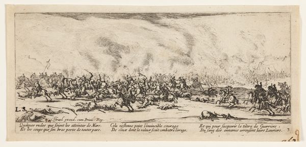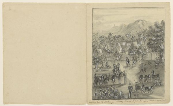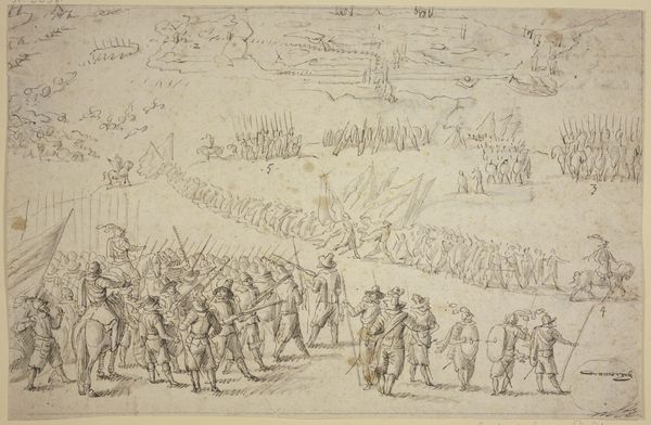 Editor: Here we have "Negotiations between two troops drawn up in battle order," a drawing in ink, pencil and paper by Cornelis de Wael, created sometime between 1602 and 1667. It strikes me as quite a formal, almost stage-managed scene. What stands out to you? Curator: Well, considering De Wael's historical context, it is crucial to examine the role such imagery played in shaping public perception of military and political events. The early to mid-17th century was a time of intense conflict and negotiation across Europe. Do you notice how the composition emphasizes the balance of power? Editor: Yes, the two sides mirroring each other, but what about the rather mundane landscape? Does it diminish the scene’s significance? Curator: Not at all. It might suggest that these "negotiations" occur on contested territory, making the power dynamics visible. Were such depictions, perhaps, intended to legitimize or even glorify specific political stances on war? The very act of drawing and disseminating such images became a political tool. Editor: So, it's less about an objective record and more about constructing a particular narrative, using even landscape for the political imagery? Curator: Exactly! Consider the role that patronage, either from military figures or political entities, would have played. This isn’t merely art, but also an artifact deeply embedded in socio-political structures. How does it change your understanding of the work? Editor: It’s much richer now. I see the image as part of a larger conversation on power and representation, it reveals much about 17th-century politics beyond the literal depiction of a negotiation. Thanks! Curator: Indeed. Looking beyond face value reveals the intentional crafting of a specific image, showing just how crucial it is to understand the art's historical moment.