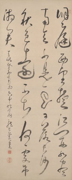 Curator: I'm immediately drawn to the dance of those black lines against the aged paper—it feels like a whisper of thoughts caught on the breeze. What is this piece? Editor: We're looking at a work titled "Waka Poetry," dating from around the 18th century. It's currently held at the Minneapolis Institute of Art and attributed to the artist Ryū Kōbi. It's executed in ink on paper. Curator: The strokes are so alive, aren't they? Each one a little story, pushing and pulling. Do you see how the artist plays with the weight of the ink? Thick here, a fragile thread there. I'm fascinated by that contrast. Editor: Absolutely. The interplay of thick and thin strokes is critical in calligraphy. These variations serve not only to create visual interest but also emphasize the rhythm and intonation inherent in the language, in this case poetry of the "waka" form. This is a classical Japanese poem, short and intensely focused. Curator: So, is the idea that this isn’t just about pretty writing— it’s about trying to paint the soul of the words, too? You feel the quiet in the piece… something meditative, right? It’s interesting that you say this is from the 18th century, and is in Minneapolis… how cool to cross oceans like this. Editor: Exactly. Each brushstroke aims to convey the poem's essence, blending aesthetic beauty with profound meaning. We see that Asian art, and specifically Japanese calligraphy, employs an incredibly sophisticated vocabulary rooted in centuries of cultural history. This poem on paper is able to transcend time and geography, thanks to the depth and complexity of that symbolic structure. Curator: Makes you wonder what the poem’s about, doesn't it? If the strokes alone have so much emotion, I'm betting the poetry itself would just pull you in completely. So many mysteries behind these gentle lines... it is lovely how this calligraphic design really asks you to stop and think. Editor: Indeed. And this blend of line, texture, and poetic significance really exemplify what happens when writing becomes high art.