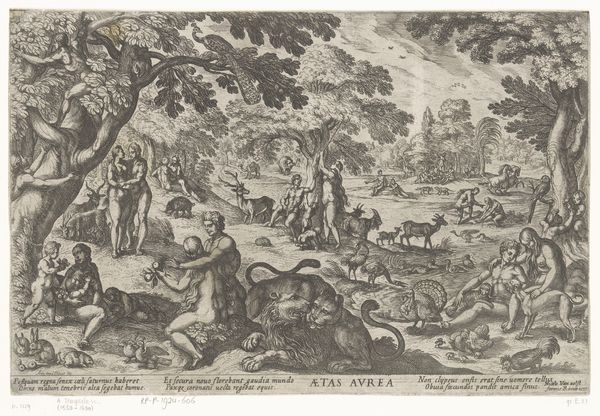 Editor: This is "Plate 1: Cain Killing Abel, from 'The Battles of the Old Testament'" made sometime between 1585 and 1615 by Antonio Tempesta. It's an engraving rendered in ink. It's a rather brutal scene, yet rendered with almost delicate detail in the landscape and the figures. What stands out to you? Curator: Well, consider the context of its production. Engravings like these were commodities. Note how Tempesta efficiently utilizes line work to describe textures – animal fur, human flesh, foliage. The material reality is that this wasn't fine art, but something made to be reproduced and consumed widely. How does the means of production inform our reading of its brutal subject matter? Editor: So, because it was made to be reproduced, it kind of numbs the horror? It's like a factory producing violence. Curator: Precisely. Think about the division of labor involved. Someone designed the image, someone engraved it, someone printed it, someone sold it. This detachment between the artist's hand and the final product affects its meaning. Consider the consumer; What sort of visual repertoire are they assembling in their homes through works like these? Does the image serve a moral or didactic function, or simply cater to a taste for violence? Editor: That’s a good point. It’s not just about the artistry; it's about the entire network that brought this image into existence and the impact it has as a mass produced object. Curator: Exactly. We're looking at not just art, but the industry around it, and how that shapes what the artwork *is*. I find myself dwelling on this image as a tangible testament to early modern anxieties regarding mass culture and availability. How unsettling that access and technology facilitated distribution of this brutal violence... Food for thought! Editor: Absolutely, I hadn't considered that. It shifts my focus from just the biblical narrative to the social and economic forces at play.