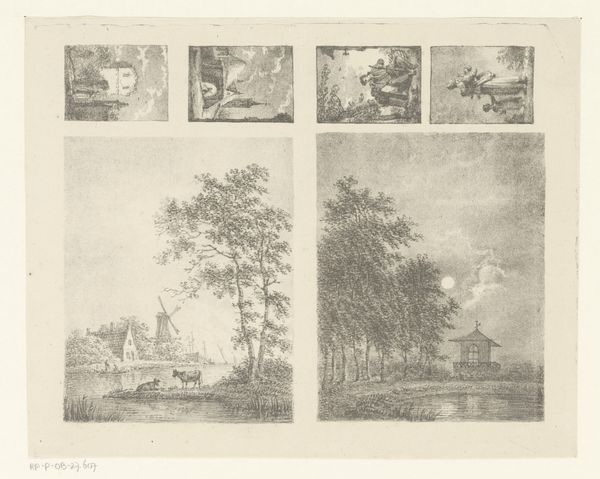 Here is "Vier voorstellingen," or "Four views," an etching by Johann Caspar Nepomuk Scheuren. These four miniature scenes are arranged on a single sheet, each a tiny window into different worlds of landscape and human activity. The artist used delicate lines and a monochromatic palette to create subtle variations in light and shadow. Scheuren masterfully uses composition to guide the viewer's eye in each of the four scenes. Each scene contains horizontal lines formed by water, land, or horizon. These linear structures create a sense of depth, as do the varying scales of objects and figures that become smaller in the distance. In the top left, boats glide across the water, while the top right shows figures clustered on a raft. The lower left shows a tranquil waterside scene with trees mirrored in the calm water. The lower right shifts to an elevated perspective, showing a landscape with distant hills. These images are like lines of text that convey information through pictorial codes. They reveal an interest in the landscape and human form and how these elements interact to convey meaning.