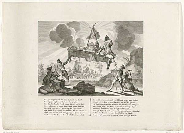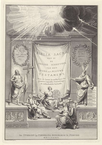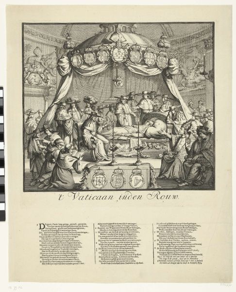 Curator: We're looking at "Allegory on the Coronation of Francis I Stephen as Emperor, 1745," an engraving. Editor: It strikes me as rather busy, overflowing with detail, figures, and symbols jostling for space within the frame. Baroque, definitely! Curator: Precisely. This print, currently housed at the Rijksmuseum, commemorates the historical event of Francis I Stephen's coronation. However, it operates beyond a straightforward record; it's laden with allegorical meaning. The publisher remains anonymous. Editor: Let's delve into the composition. There’s a clear hierarchy at play here. The Emperor occupies a central position on a raised dais, bathed in light, suggesting divine endorsement. I notice the cherubic figures surrounding the emperor, but below, defeated figures and discarded weapons indicate those that opposed Francis. The radiant light emanating from above overwhelms almost everything. Curator: Absolutely. Light functions symbolically, almost divinely sanctioning his emperorship. Below the dais, the engraving shows prostrate figures, their arms scattered—visual symbols for conquered rivals or foes, brought to submission beneath his reign. Editor: How interesting. To my eye, the print appears a little propagandistic—designed to communicate and reinforce political authority. What could the meaning of the crests beneath the Emperor's platform refer to? Curator: Those represent the territories and states under his domain. They bolster Francis’s authority and solidify the notion of a unified empire under his rule. You can consider those crests as markers of legitimacy, demonstrating Francis I Stephen’s right to govern. Editor: It strikes me that, beyond merely capturing a historical occurrence, the composition presents Francis I Stephen’s imperial achievement, strategically positioning his rise to the throne amid historical rivalries and societal allegiances of the mid-18th century. Curator: You’ve pinpointed a key aspect: the historical placement of Francis as not only a ruler, but as a central figure. The visual symbolism here is used quite intentionally to reinforce legitimacy. Editor: This has opened up a much broader conversation beyond the work's intrinsic artistic value. Curator: Indeed; this allows a critical viewing of its cultural purpose and influence as well.