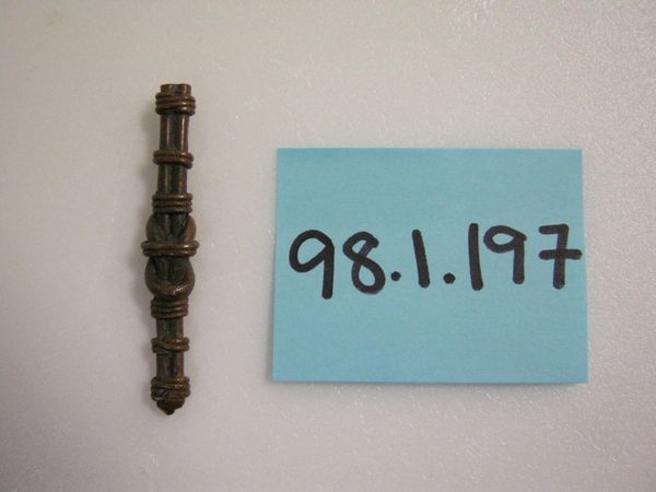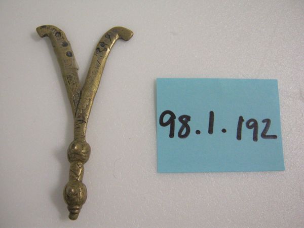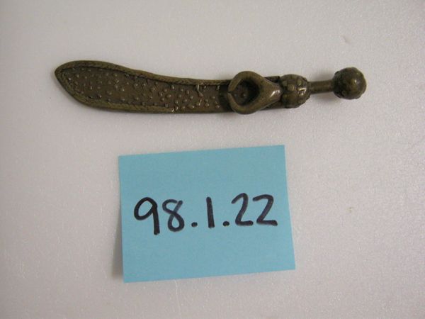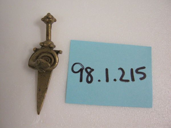 Curator: Isn't it lovely? Here we have an Akan goldweight from the 19th or 20th century, currently held at the Minneapolis Institute of Art. It's called "[Sword]". The piece combines brass and what appears to be a found object in its construction. Editor: There’s something about it that feels both powerful and unsettling. Is it just me, or is there an almost visceral sense of authority emanating from this small sculpture? Curator: Absolutely! It embodies the idea of power. In Akan culture, these goldweights weren't just used for measuring gold; they served as proverbs, visual metaphors for laws, social mores, and the spiritual understanding of the world. This particular piece would have held complex symbolic weight for those who understood its iconography. Editor: Looking closer, the sword itself is a common enough symbol of leadership, bravery and military strength... But it's been stylized, almost softened. The brass gives it an enduring, even mythical quality. And that figure, what is it saying, or commanding, even in its static pose? It almost looks like the form of a queen. Curator: Precisely. What I find fascinating about Akan art is how deeply embedded symbolism is within even seemingly functional items. A sword-shaped goldweight would prompt conversations, reminding people of the ethics of power. Its imagery suggests a system of checks and balances and perhaps a focus on responsible authority. It certainly captures that concept so clearly. Editor: It makes you wonder, doesn’t it, how the smallest objects can contain such expansive meaning? Perhaps we should carry goldweights instead of credit cards, as reminders of what truly holds value? Curator: Perhaps. We could all do with a little more tangible symbolism in our pockets! It invites me to reflect on what shapes my value system and my leadership style. Editor: Agreed. These old objects really help the symbols keep going through time, shaping culture again and again.