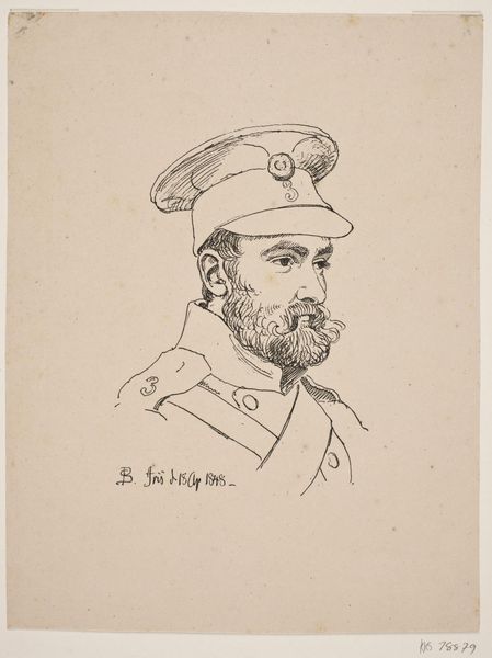 Curator: Here we have Johannes Hari's "Buste naar links van een soldaat," created sometime between 1817 and 1882. It's an ink drawing, a simple yet evocative portrait. What’s your immediate impression? Editor: Austere, almost defiant. There's a certain guardedness in his eyes, despite the informal sketch-like quality of the drawing. It speaks to a sense of duty perhaps, mixed with vulnerability. Curator: It is a powerful study. Notice how the hat is slightly askew, lending a casual air that contrasts with the implied military attire and bearing. What sort of archetypes come to mind as you gaze upon the imagery, particularly around his garb? Editor: The military clothing, the beard, and that soft cap suggests a non-commissioned officer perhaps. However, the way he wears his beard challenges established norms; almost artistic, even bohemian, disrupting that authoritarian stereotype. This speaks volumes, in a time of rising nationalism and defined social roles. Curator: Interesting interpretation! I see in it echoes of Dutch masters, but translated into a contemporary setting and personal introspection, it calls forth historical echoes while also suggesting the timeless experience of military service across time and place. The eyes are particularly intriguing; do you see a tension between outward bravado and inward contemplation? Editor: Absolutely, the gaze is conflicted. There's a subtle rebellion brewing beneath the surface. We have a working-class soldier experiencing internal dissonance—perhaps contemplating the violence and injustice inherent in war itself. A subversive self-portrait, perhaps inadvertently questioning power. Curator: It definitely opens avenues to multiple interpretations! It speaks to the burdens and contradictions that figures like him carry across different historical periods, in his representation of state power while holding space for individualized identity. Editor: For me, Hari’s work is relevant even now, as the topic of warfare has risen back up. It's an invitation to confront not just the romanticism of heroism, but the nuanced experiences of those embroiled within political struggle. A necessary complexity. Curator: Indeed, and this complexity ensures the piece will resonate and continue inspiring reflection, particularly regarding ideas of military history, portraiture, and identity, well into the future.