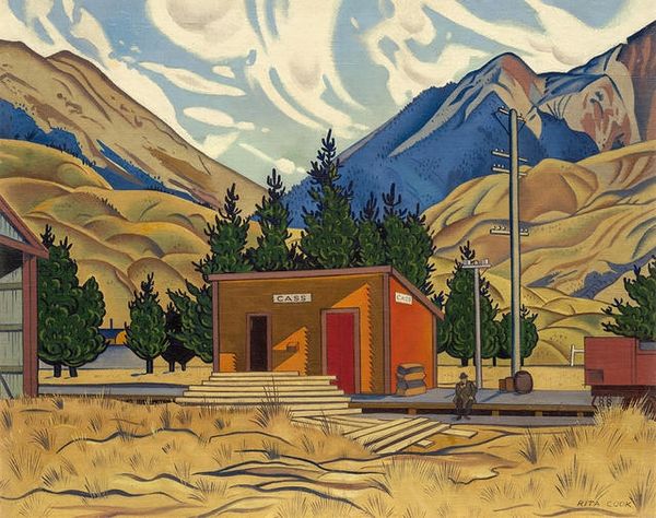 Curator: Rita Angus created this watercolour, titled "Mountains, Cass," in 1936. It’s currently held at the Christchurch Art Gallery Te Puna o Waiwhetū in New Zealand. Editor: My immediate impression is one of stillness and starkness. The colors are muted, but there’s also something comforting in the angular shapes. It feels like a landscape of the mind. Curator: Angus's use of watercolour here really emphasizes the raw materiality of the landscape, doesn't it? You can almost feel the grain of the paper, and the precise control in the brushstrokes makes the whole composition feel quite solid, even architectural. Look how the planes intersect! It echoes the labour involved in constructing a landscape both physically and conceptually. Editor: Absolutely, but what truly draws me in are those repeating triangular shapes throughout—the peaks, the roofs, the fields. They almost feel like variations of a sacred symbol pointing upwards. Considering the historical moment, might Angus have intended a more uplifting image, countering the grim reality of the Depression with these visual beacons? Curator: That’s a fascinating point. There’s definitely a sense of striving, or at least a desire to bring order to the landscape. But I also think it's interesting to see the geometric forms in relation to New Zealand modernism at the time. How do you interpret this in a national context, especially regarding representation and material conditions? Editor: The cottage, for me, signifies resilience, a sanctuary amidst a vast and powerful landscape. You know, rural isolation and finding solace in nature were becoming quite potent national narratives by the 30s, perhaps influenced by global events? This isn’t merely a landscape study but an embodiment of an ideology, seen through the symbolic weight of each element. Curator: That makes me consider how watercolour, a "humble" material, has been traditionally perceived compared to oil paint, particularly concerning labor and the marketplace. Perhaps choosing this medium reflects something similar about the artist herself. Editor: Incredibly perceptive! I am just struck, really, by how a simple visual of "Mountains, Cass" reflects not just geographic location, but emotional, social and historical strata so richly woven together. Curator: Exactly, it makes you reflect how this artwork can offer such varied and fascinating views through the lens of materials.