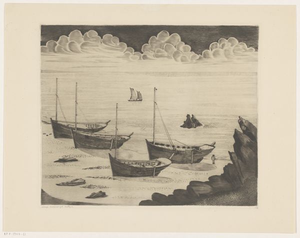 Karl Meunier rendered this view of boats in the Schelde at Rupelmonde with pencil. The scene is dominated by boats, symbols of transition and commerce, set against a somber sky. These vessels, with their high masts and fluttering pennants, evoke a powerful sense of aspiration. Think of similar vessels portrayed in Dutch Golden Age paintings, symbols of a nation's wealth and ambition, or even earlier, the ships of the ancient world, vessels of exploration. The artist captures not just their physical presence, but also the deeper psychological currents they represent: the human drive to explore, trade, and connect. Note how the artist uses chiaroscuro. It's a technique that engages us on a subconscious level, reflecting a world of light and shadow, hope and uncertainty. Meunier taps into the same deep-seated human emotions we find in works throughout history. Indeed, the image of a boat on water is a recurring motif, a symbol that continues to evolve, carrying new layers of meaning across time.