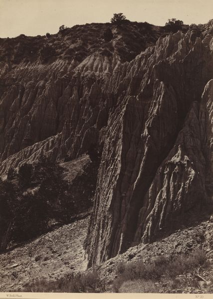 Curator: This gelatin-silver print by Arthur Gabler, titled "Gemmipas, Leukerbad," transports us to the Swiss Alps sometime between 1873 and 1888. Editor: Immediately, I feel a sense of sublime vastness, almost intimidating. The muted tones give it a ghostly, dreamlike quality. It’s as if the mountain itself is a faded memory. Curator: Indeed. Gabler’s landscape photography, particularly within the Pictorialism movement, often sought to elevate photography to the level of fine art, emphasizing artistic expression over pure documentation. We see the use of soft focus, manipulating the chemical process, and choices of composition all leaning to those objectives. Editor: Right. And it is not without issues that such visual strategies also romanticize landscapes while potentially glossing over colonial exploits and industrial expansion impacting marginalized communities living in the area. Do we ever challenge the viewer on issues of class, gender, race and access at the time of its making? Curator: That is certainly relevant context when interpreting Gabler's piece. At the time the romantic gaze that was popular, was largely associated with aristocratic audiences and not commoners. But do you feel that by simply omitting human subjects from this alpine vista, is Gabler implicitly endorsing a vision that is aligned to the interest of the time, maybe that this a scene without visible labour is an elitist proposition? Editor: Maybe not, however this scene feels desolate, almost like a warning against the folly of human hubris against the power of nature, or maybe not against that nature itself, but who controls it? I keep asking myself these types of questions. Curator: The composition is certainly powerful, the sheer cliff face on the right dominates, contrasting against the soft slopes on the left, creating an interplay between mass and ethereal lightness. It offers a picturesque framing, it pulls you into an idealized experience. Editor: But is that "ideal" an equitable ideal? Photography in the 19th century held immense power in shaping perceptions of landscapes and their inherent values. To examine images such as this, acknowledging not only their aesthetic and emotional dimensions but also their latent politics and ethical dilemmas is really pertinent. It is more of a mirror reflecting not just the beauty of a mountain range but also who gets to see it and interpret it, you see? Curator: Precisely, examining an artwork as a cultural and societal product shaped by diverse power dynamics enables us to see more clearly these types of narratives and perspectives. Editor: Absolutely. Thinking critically and intersectionally when assessing photography helps unlock these silent yet persuasive dialogues—especially concerning artworks from bygone times! Curator: Yes, exactly—thanks for reminding us to be skeptical and self aware and also bring to the surface some interesting points.