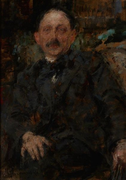 Curator: This is Olga Boznanska’s portrait titled “Etienne Collignon.” Although undated, it’s rendered in oil paint with a visible impasto technique, giving it a tangible texture. What’s your initial impression? Editor: The first thing that strikes me is a certain melancholy; a profound pensiveness hangs over the figure. The muted palette certainly reinforces that impression, but also hints at formality—dark colors for clothing being so very expected for a serious gentleman's portrait in many times. Curator: Absolutely. Consider the subject, a man identified as Etienne Collignon. He’s depicted formally attired, suggesting perhaps a bourgeois sensibility and expectations. However, Boznanska was part of the circle of Polish artists working in France and other expats who challenged the status quo. What underlying meanings do you sense at play here, beyond pure likeness? Editor: The hands especially convey much: the crossed fingers of Collignon suggest he's thinking intently, weighing his options or remembering things best forgotten. This composition resonates strongly, as if his personality transcends this specific historical moment, speaking to our own search for identity and stability. Curator: Precisely. And, perhaps this search wasn’t free from conflict: There are visible layers, reworked sections that reflect the complex positionality occupied by folks caught between social classes, expectations, cultural upheaval, and identity formation within an impressionistic culture. What Boznanska does brilliantly is capture Collignon’s potential struggles; she highlights a universal tension between wanting to belong and yearning for individual expression and progress. Editor: I also observe subtle color choices used by Boznanska that support this. For instance, the light underpainting shines through his skin in a range of very expressive pastel tones. The subject's face feels as if made out of clay--like a human figure we can identify with in multiple ways. I see her brushstrokes suggesting resilience even in his moments of reflection. It's not just a portrait of a man but an introspective image reflecting the challenges of selfhood. Curator: Indeed, she's painting so much more than an exterior; Boznanska hints at the unseen burdens. This piece serves as a reminder that the people and struggles of yesterday still deeply inform our existence today. Editor: Very true; it prompts us to look at the world around us in ways that are attentive to cultural shifts and transitions but at the same time aware of archetypical images and visual motifs which go on over centuries and decades.