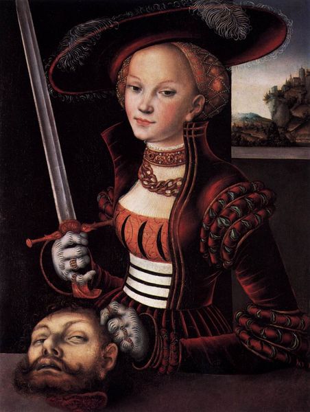 Editor: Lucas Cranach the Elder's "Judith and Holofernes"... the painting's almost unsettlingly beautiful given its subject matter. The oil paint gives her dress a lusciousness, but the contrast with Holofernes’s severed head is stark. What can you tell me about the process or materials Cranach used to achieve such different effects? Curator: I see it as deeply entrenched in the material culture of its time. Cranach, as a painter close to the Wittenberg court, wasn't just depicting a biblical scene; he was crafting an object of display. Consider the oil paint: its richness wasn’t simply aesthetic. Oil paint was expensive; it was a marker of status. The detail of Judith's attire, that lush green velvet, isn’t just about artistry; it’s about signalling wealth and refined taste, both for the artist and the patron. Look closely at the sword. Notice any indication as to where that particular instrument may have originated? Editor: It’s so reflective. It seems the high level of detail reflects something of importance about it... I don't know anything about early sword making. How did manufacturing such instruments tie in to cultural power in Cranach's time? Curator: Exactly! Skilled artisans are required to produce weapons. They were incredibly valuable, like art; objects traded across regions. This is further emphasized by how Judith is staged: the very act of displaying this image is tied into contemporary conversations around female agency, religious authority, and the economics of artistic production. How do you think Cranach challenges, or perhaps reinforces, those social dynamics with his careful arrangement of color and material? Editor: So, it's about Cranach using materiality to negotiate and perhaps subtly comment on the complexities of his social context? Something that feels a world away. It's less a historical object and more an intersection of materials, skill, and social messaging! Curator: Precisely! Recognizing materiality allows us to see art as more than just aesthetics. Instead, it is deeply implicated within webs of labor, value, and cultural exchange.