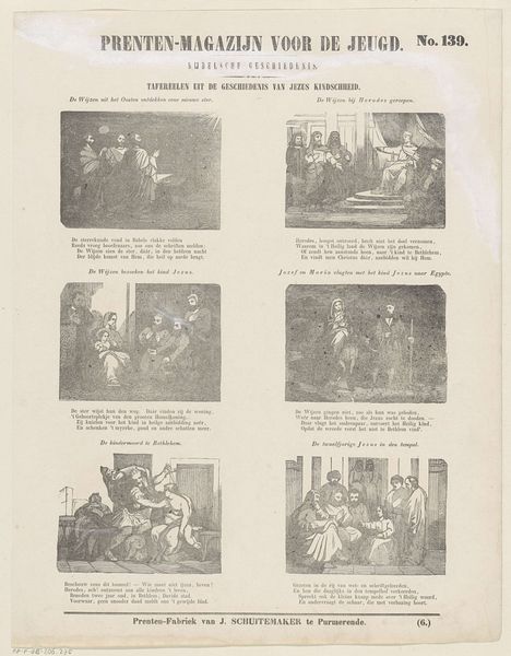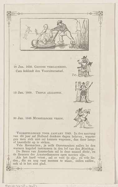 Editor: This print, titled "April," was created in 1849 by Friedrich Robert Prinz. It’s an engraving on paper, so a reproducible image. I'm immediately drawn to the text alongside each little scene, it gives this print a strange sense of narrative, almost like a calendar or news sheet. How would you interpret this work? Curator: This print really highlights the socio-political role of printed matter at this time. Engravings were not just art, they were a means of circulating information, crafting narratives and often nationalistic myths for a growing literate public. Think about the labor involved: the engraver translating events and ideas into a tangible, reproducible form, shaping how people understand history and their place in it. What I wonder is: who exactly was the audience for something like this and how would this “April” calendar page be consumed or circulated? Editor: So it's about more than just aesthetics; it's about the labor and means of distributing information. Given that it looks like a calendar and it's written in Dutch, would it have just been something produced and sold in the Netherlands? Curator: Perhaps, but let's also think about where Prinz himself would have been trained as an engraver and if this format was commonly used. The very act of making and distributing prints could also have forged or maintained communities. And note that Prinz wasn't inventing this. Editor: That’s a perspective I never really considered. I was so focused on what it *looked* like, but by shifting the emphasis, it completely reframes the role of the artist and the artwork. Curator: Exactly. It reveals how intertwined art is with the wider world of production, distribution, and social meaning-making. What seems like just a calendar page points towards all this wider materiality and context. Editor: It definitely makes me rethink how I see prints! Thanks.