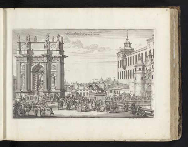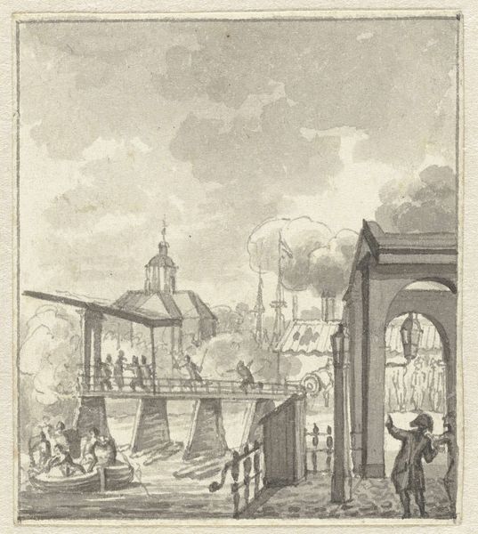 Jacob van der Ulft's rendition of a grand square, executed in pen and wash, presents a study in spatial organization and architectural monumentality. The circular composition frames a bustling scene, anchored by an obelisk at its center. This vertical thrust bisects the horizontal expanse of the square, around which palatial buildings are arranged. The architectural forms are rendered with meticulous detail, emphasizing their imposing scale. Yet the figures populating the square add a dynamic layer, their diminutive size accentuating the grandeur of the surrounding structures. Van der Ulft plays with perspective, creating depth through the recession of architectural elements. The monochrome palette, modulated through delicate washes, lends the scene a sense of classical restraint. The sky, rendered with fluid strokes, contrasts with the angular precision of the buildings, creating a dialogue between the natural and the constructed. This interplay suggests a broader reflection on the human ambition to shape and order the world, and how the artist seeks to capture such ambition.