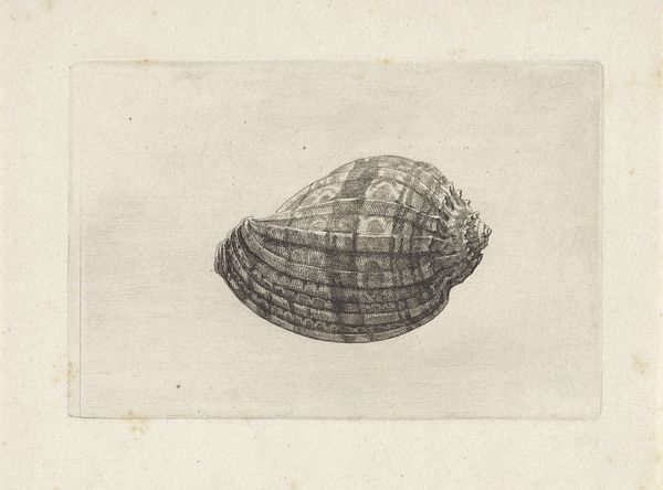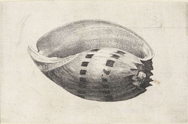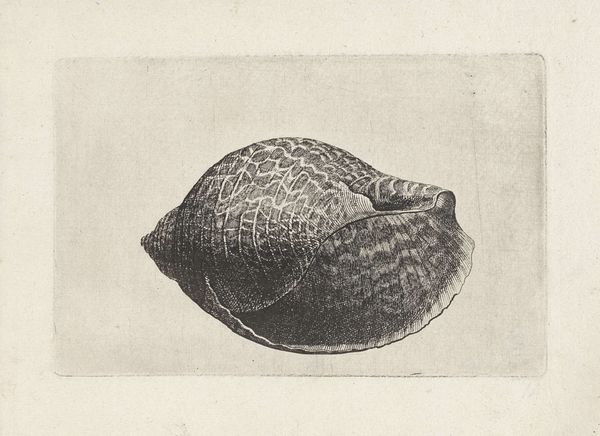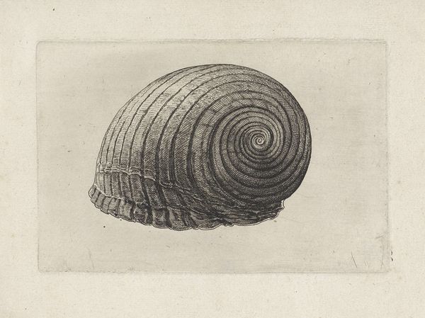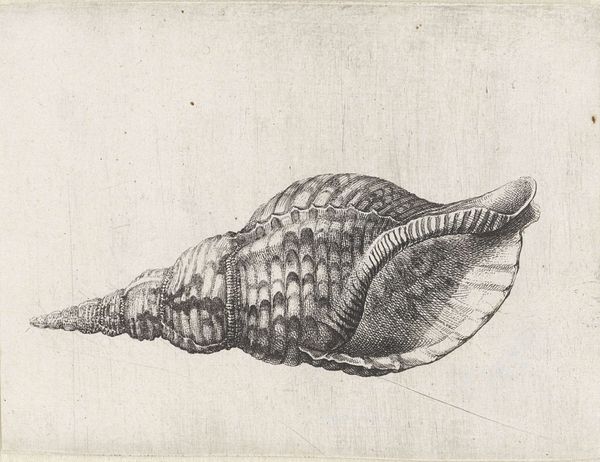Editor: Here we have Wenceslaus Hollar's etching, "Schelp, turbo sarmaticus," created sometime between 1644 and 1652. It's a baroque rendering of a seashell... the detail is incredible! What do you see in this piece? Curator: It’s fascinating how Hollar, during the Baroque period, chose such a seemingly humble subject. Considering the 17th century's intense focus on exploration and trade, a simple shell becomes a potent symbol. Editor: How so? Curator: The shell could be seen as a representation of global exchange, brought back by traders. It places value on previously ignored perspectives. Furthermore, consider the shell itself as a symbol of protection and the feminine. Does Hollar subtly address the often-overlooked contributions and vulnerabilities of women in this era of discovery? The intricate details elevate it to more than mere decoration. Editor: So, you are saying it might also be communicating gendered messages and socioeconomic issues? Curator: Precisely! The level of detail also reflects a burgeoning scientific curiosity – almost like a cataloging of the natural world. And think about who could afford these prints, who had access to this type of scientific imaging? It all points to issues of power, class, and access to knowledge during that time. Editor: I never thought a seashell could hold so much meaning! Thanks, that gives me a lot to consider. Curator: Indeed. The beauty of art lies in its ability to mirror the complexities of its time, challenging us to examine power structures and historical contexts.