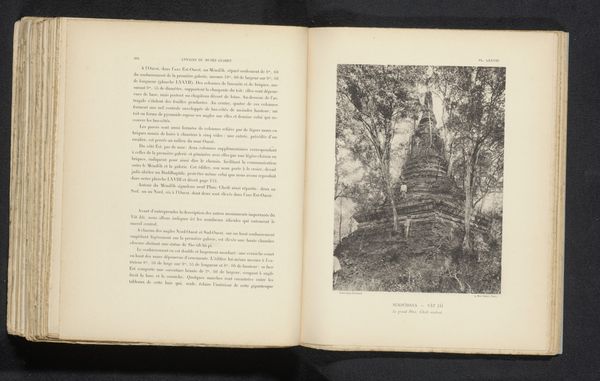 Curator: I'm struck by the way this image, “Gezicht op een tempel in een bos,” evokes a sense of hushed reverence, a quiet grandeur overtaken by nature. The dense forest seems almost to swallow the temple. Editor: This print, created before 1895, shows a view of a temple deep within a forest setting. It offers an intriguing lens through which we can examine colonialism’s gaze on Southeast Asia and its cultural heritage. Curator: Absolutely. The image becomes a record, a document shaped by a very specific power dynamic. How does it shape or participate in Western narratives about the “exotic” East and how were temples presented at this time? Editor: Indeed. We see here a very specific choice in framing. Notice the dense foliage, creating this sensation of discovery. The photograph then presents the temple as an object waiting to be found by an “adventurous” and European gaze. Furthermore, the temple is framed through a Westernized, photographic perspective, highlighting a specific, consumable angle of Southeast Asian architecture and art. Curator: The fact it's in print also means it’s intended for circulation and reproduction, shaping a wider public's perception of these spaces. Was this meant to serve some sort of documentary purpose, or perhaps something more propagandistic? Who controlled this circulation of the image and whose voices were present? Editor: It makes me consider the power of visual narratives. These images, however serene they appear, reinforce specific ideological standpoints that would allow colonial forces to appropriate both the cultural heritage and spaces that house it, to claim that preservation requires a Western hand. It leads to so many considerations on accessibility, viewership and ultimately whose histories are centered here. Curator: That intersection of visuality and ideology—the image, the observer, and the observed—highlights not just aesthetic beauty but power dynamics at play. It's more than just a photograph, but it becomes evidence. Editor: Precisely, turning the silent stones into powerful tools for narratives still influencing the dialogues on cultural exchange today.
