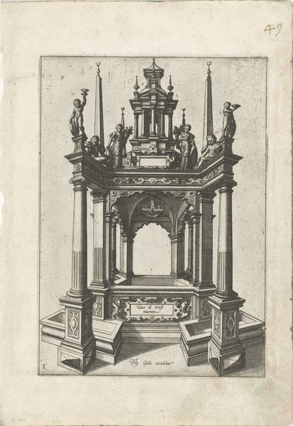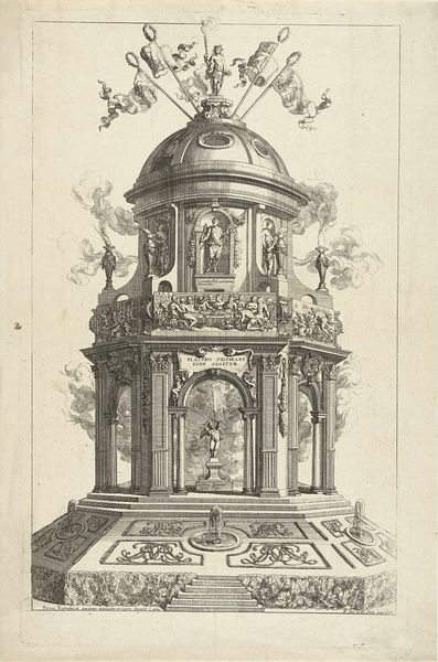 Curator: Here we have Gaspar Bouttats’ engraving, “Altar in the form of a tempietto erected by magistrates on the Meir, 1685,” created in, naturally, 1685. Editor: It's strikingly formal, even severe. The architectural detail is so precise. The stark lines create a sense of rigid order. Curator: That order reflects the societal structure of Antwerp at the time, wouldn't you say? The altar, dedicated by city magistrates, served to reinforce the relationship between religious authority and civic power. The inclusion of "SPQA" probably refers to "Senatus Populusque Antverpiensis," signifying the Senate and People of Antwerp. The labor involved in this detailed engraving, from the artist to the printer, speaks volumes about the value placed on such displays of power. Editor: Absolutely. The conspicuous display of religious iconography, the crucifix at its heart, must be viewed in the context of the Counter-Reformation. Antwerp was, after all, a staunchly Catholic city at this time. So the magistrates are publicly reinforcing not only their civic role but their adherence to a specific religious and political stance. It highlights issues of faith, class and the construction of early modern identity in a fractured Europe. The Baroque exuberance is present but feels restrained and controlled, almost weaponized. Curator: Indeed. Consider the materiality: ink pressed onto paper, mass-produced and distributed to disseminate this message widely. And while the print medium allowed for reproducibility and a wider reach, that doesn't necessarily mean that everyone had access to these kind of prints; it probably hung in the offices of civic institutions. Editor: The image prompts me to question who was really served and protected by this very visual alignment of powers. Were the poor, the marginalized, or those deemed "other" truly represented in this vision of civic order and spiritual devotion? Curator: It certainly wasn't intended for them! It’s all about controlling the narrative by showing material production of the images themselves; printing techniques as well as its Baroque display all demonstrate a material dimension of production. Editor: Agreed. Ultimately, it forces us to look beyond its exquisite details and see the artwork for what it is: a product of its time, steeped in social and religious power dynamics. Curator: A clear view of both technique and historical meaning, yes.