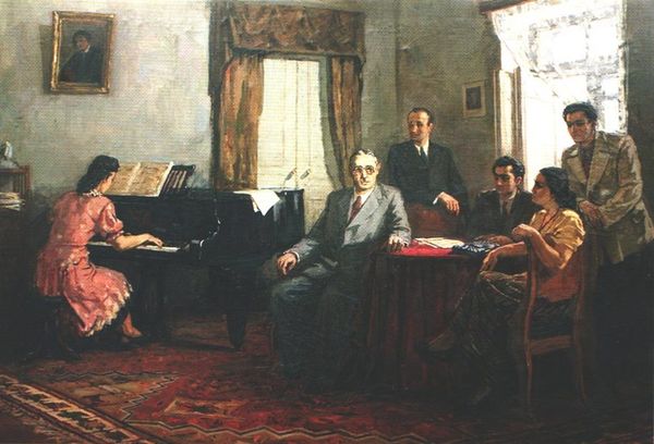 Curator: Let’s turn our attention to Sir William Quiller Orchardson’s “Her Mother’s Voice,” residing here at the Tate. Editor: There’s a melancholic stillness to this domestic scene. The scale emphasizes the distance between the figures; it is almost claustrophobic. Curator: Orchardson masterfully employs composition to create narrative tension. Note how the man is isolated in the foreground, set apart from the musical couple. Editor: Absolutely. This separation speaks volumes about Victorian social dynamics, particularly the silent suffering often endured by men within patriarchal structures. His emotional labor is dismissed in favor of superficial entertainment. Curator: Indeed, the muted palette and formal arrangement underscore this sense of restrained emotion. The architecture and interior decoration also denote a bourgeois setting. Editor: It also reads as a critique of the limited roles assigned to women, singing for their supper in that gilded cage. Curator: I find that Orchardson captured a poignant moment. Editor: A somber reflection on the silent battles fought within the confines of Victorian society, wouldn't you agree?