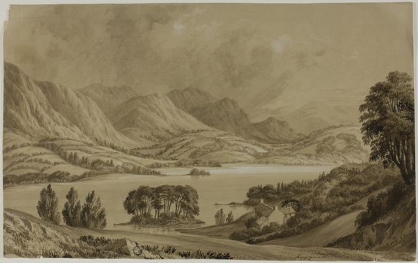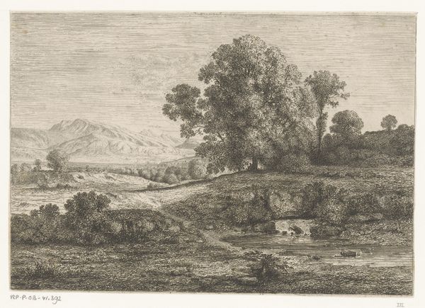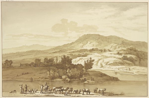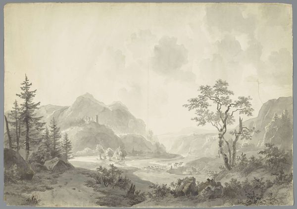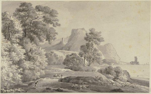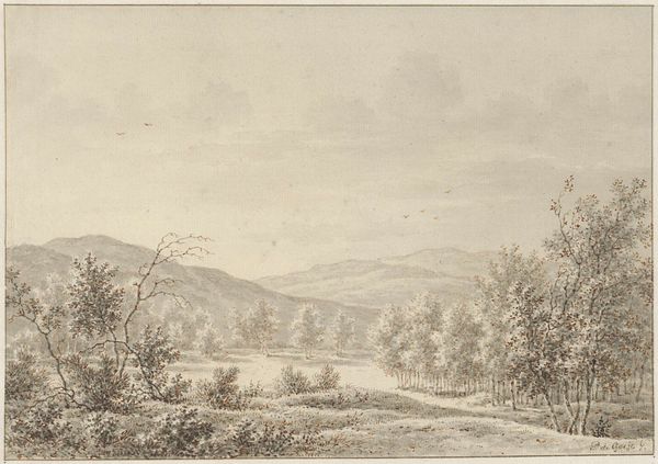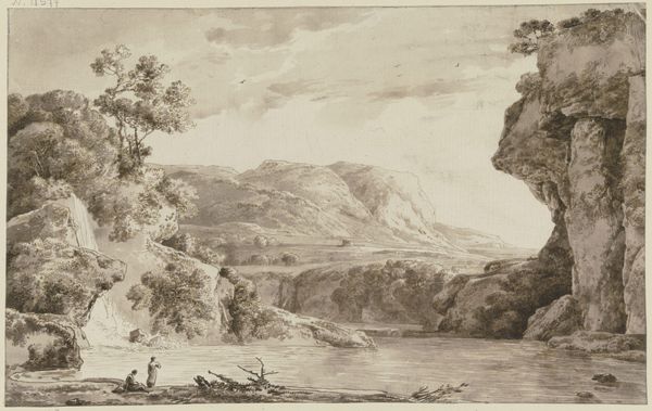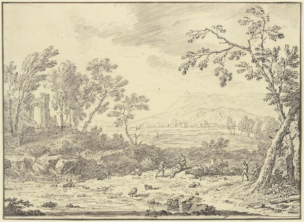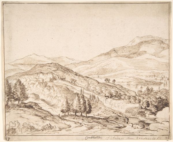 Editor: Here we have “Ebene vor dem Gebirge, rechts ein See, auf dem Weg verschiedene Figuren”, a drawing by Jacob Esselens, probably from the Dutch Golden Age, created with ink. I am struck by how the artist uses the simplicity of ink to capture such an expansive landscape. It’s like he has meticulously constructed a world using just lines and tones. How would you interpret this work from a formalist point of view? Curator: The beauty here lies in Esselens’ expert manipulation of line and form to create depth and spatial relationships. Observe how the density and direction of the lines shift, meticulously describing textures, volume, and even suggesting atmospheric perspective. Editor: I notice the variation in line thickness. What does that achieve? Curator: Precisely. The varying weight of the lines emphasizes certain elements over others. Notice how darker, bolder lines in the foreground contrast with the delicate hatching in the distant mountains, reinforcing a sense of receding space and directing our focus. What semiotic readings can we extract from the interplay of planes and motifs? Editor: Well, the horizontal plane is stable, but that's juxtaposed with the textured complexity of trees in the foreground and a large mountain in the back... perhaps a meditation on humankind's relation with nature? Curator: It might also address the relationship between detailed observation and schematic representation. Esselens offers visual order rather than illusionistic mimesis. Editor: So, it's more about Esselens highlighting the act of seeing and organizing than about recreating reality. I didn't think about that before. Curator: It reveals a conscious construction, which engages the viewer in deciphering visual language. It reminds us of the structural underpinnings of pictorial space.