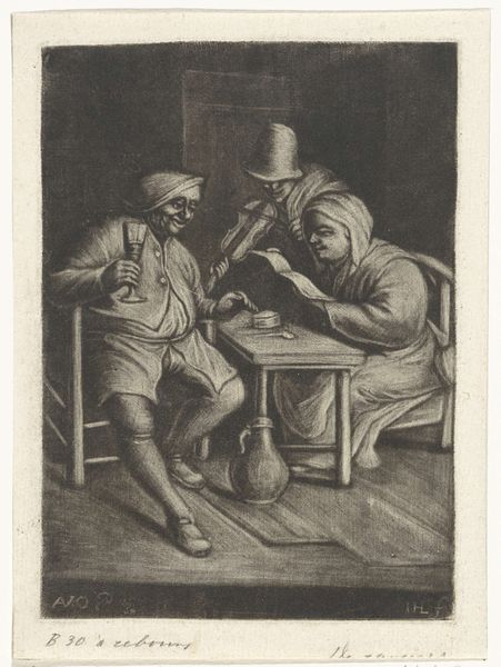 Curator: Adriaen van Ostade's "Vioolspeler bij een paar aan tafel," an etching believed to be created between 1651 and 1655, offers an intimate glimpse into Dutch Golden Age life, held now at the Rijksmuseum. Editor: It’s incredibly immersive! I immediately feel transported into that dimly lit space. The texture of the etching creates a palpable atmosphere—you can almost hear the scraping of the violin. Curator: The artist truly captures a distinct narrative in such a small format. We see the violinist, central in the composition, the couple at the table nearby, and the light illuminating each character individually. Editor: Precisely! Ostade's skilled application of line variation gives weight and form to these figures. Observe how the heavier, more deliberate lines articulate the foreground characters, contrasting against the more fleeting details of the background—a structural division of visual space. But in that visual language, the presence of music seems vital to these folks as they celebrate friendship and camaraderie around shared refreshments. Curator: That interpretation aligns perfectly with genre painting of the Dutch Golden Age, immortalizing scenes of everyday life! Alcohol vessels and instruments served as visual shorthand to show the enjoyment of ordinary, hardworking folk relaxing during this period. They symbolize the simple joys found even in humble circumstances. Editor: And even just as an isolated set of visual patterns, it still provides ample material to appreciate as a self-contained form. Ostade’s rendering suggests an environment of contained celebration. Curator: Yes, the limited tonal range adds to the intimacy; the artist refrains from dramatic contrast to create a rather harmonic feel in such a complex social environment. The composition is brilliant—centering on human connections, visually brought together by these small gestures in a cozy scene. Editor: From my side, I'm always charmed by discovering echoes from other traditions within an image. And in this genre etching, those vessels serve as humble references to those ancient bacchanals. Curator: That link, that continuity of celebration—it underscores a kind of primal need for collective joy and relaxation, doesn’t it? The genius of the etching, really, resides in that accessibility, visually rendered. Editor: Exactly! From its visual structure to its emotional accessibility, Adriaen van Ostade’s scene continues to fascinate!