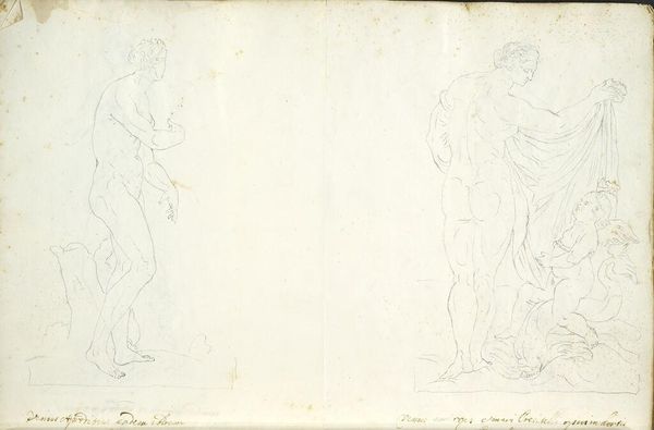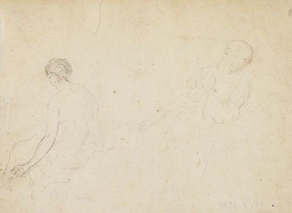 Editor: Here we have Pompeo Batoni's "Three Nude Male Figures; Study of the Right Hand of the Figure on the Left," created sometime between 1708 and 1787. It's a red chalk drawing and feels very academic. What stands out to me is the raw, almost vulnerable depiction of the male form, contrasted with that intensely detailed hand study. How do you interpret this work? Curator: I see this drawing as deeply embedded within the social and intellectual currents of its time, the late Baroque/early Neoclassical period. It's seemingly a simple figure study, but what were the intended purposes of representing the male nude in such a manner? Whose gaze does this serve and how does it connect to contemporaneous ideas of masculinity, beauty, and power, especially during a period of rising revolution? Also, consider the artist's choice of red chalk. Why not charcoal or ink? Editor: That's fascinating. I hadn't considered the power dynamics. Perhaps red chalk lends a softer, more 'flesh-like' quality, emphasizing the humanity, or even vulnerability, of the subjects? I still wonder about that hand - is it purely anatomical or is there more to its significance? Curator: Exactly. What does this detached hand signify in relation to the three male figures? Does it gesture to broader artistic themes of creation, control, and even objectification within the history of art? What kind of art historical and social narrative does this juxtaposition establish and for whom? We need to examine how ideas around gender and identity inform this artwork’s genesis. Editor: It’s interesting how seemingly simple studies can hold layers of meaning that reflect their social context. Thank you for expanding my view of it. Curator: My pleasure! These are great avenues for thinking about this study in a wider scope. By analysing artworks through the lens of cultural critique, we become much more aware of their active role in shaping beliefs of the past.