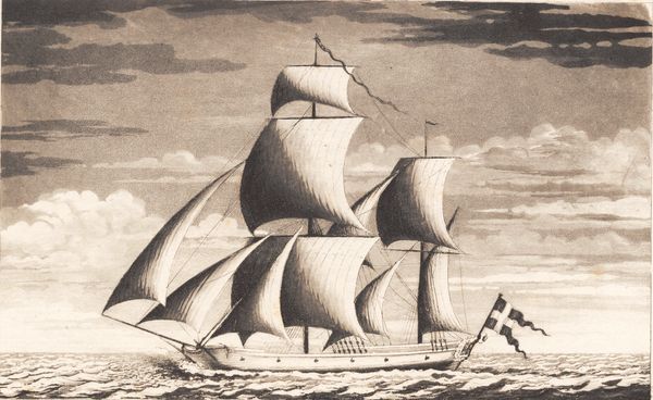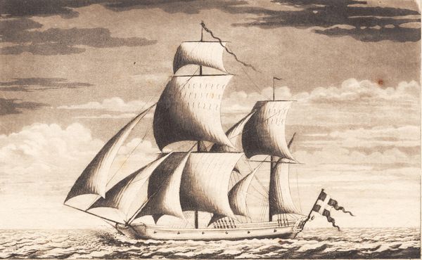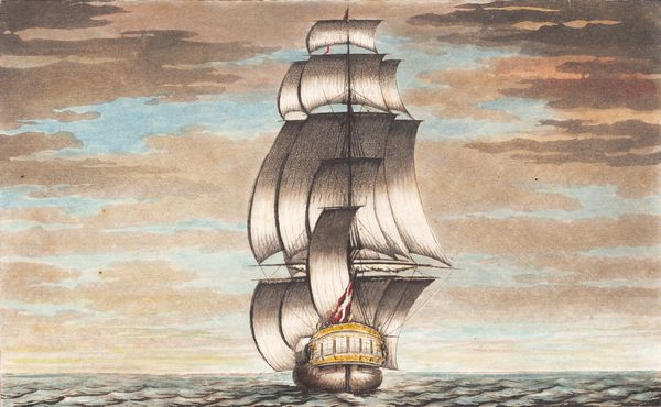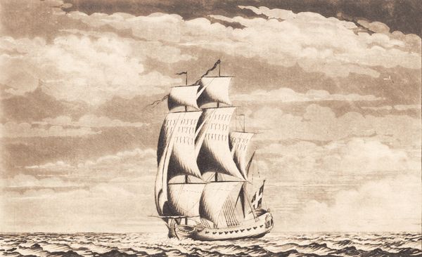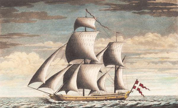Editor: So, this is "Suite af skibe" from between 1748 and 1831, currently housed at the SMK in Copenhagen. The artist is J.F. Clemens and it looks like he worked with a combination of etching and aquatint on this print, with what looks like colored pencil applied afterward. There's something very serene, almost stately about the ship sailing against the clouded sky, but what stands out to you, in particular? Curator: Ah, yes, stately is a good word. This print offers a window into a powerful, if subtle, set of symbols. Look at the way the ship cuts through the water, its sails full. In Clemens’ time, the ship was more than just a mode of transport; it was a floating embodiment of the nation’s strength, its ability to navigate and control its destiny. Editor: I see it now! It’s not just about pretty ships sailing… Curator: Exactly! And consider the Danish flag proudly displayed. Flags are potent symbols of national identity and belonging. Clemens is tapping into deeply ingrained cultural narratives here. This piece speaks to the viewer's understanding of their place within a larger community, reminding them of shared histories and aspirations. Editor: It is quite a confident depiction! I almost missed all those layers, I just thought it was pretty. Thanks, I appreciate your taking the time to explain those ideas. Curator: My pleasure. Reflecting on these visual shorthands enhances our appreciation for art. These symbols and cultural meanings persist in various forms throughout history, informing and shaping our perceptions even today.