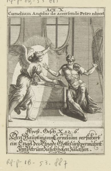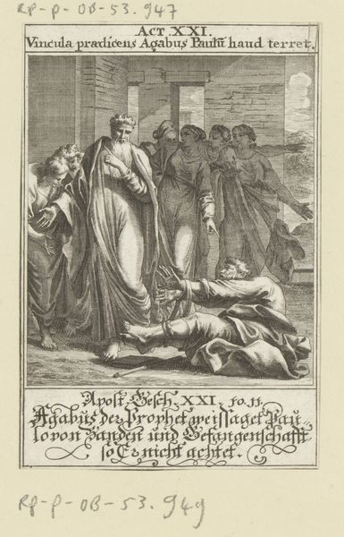 This engraving, titled 'Apostle Paul Receives News from His Sister's Son That the Jews Want to Murder Him', was made by an anonymous artist. The print depicts a biblical scene amidst the backdrop of societal tensions between early Christians and Jews. Paul, a figure at the intersection of these communities, faces a threat rooted in religious and ethnic conflict. The presence of Roman soldiers and architecture suggests the political landscape of the time, reflecting how religious matters were often entangled with imperial power. The artist captures a moment of intimate warning, where familial bonds intersect with broader conflicts. The exchange between Paul and his nephew, set against potential betrayal, offers an emotional focal point for the viewer, emphasizing vulnerability amid political and religious division. The artwork then, functions as a historical mirror, reflecting the struggles of identity and the personal dimensions of faith and belonging.